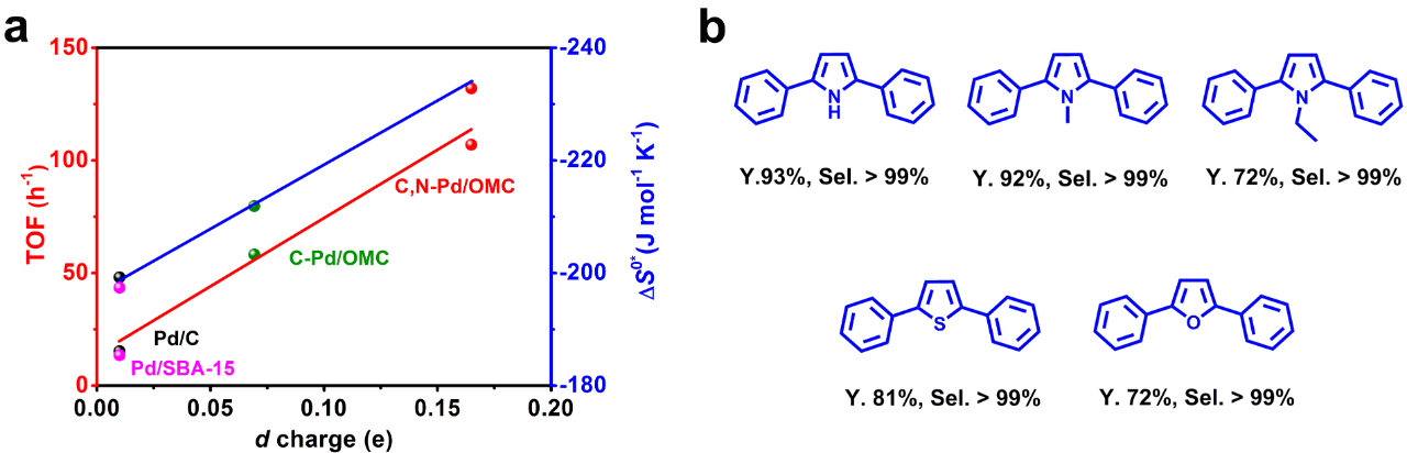 万颖教授课题组在前期研究中发现:(1)介孔炭载Pd基间隙固溶体催化剂可有效调控Pd位点电子结构,有望调节杂环分子的吸附构型和吸附能(ACS Catal. 2017, 7: 2074–2087);(2)利用实验测量的Pd位点d带电荷密度,可以线性关联复杂反应物吸附生成活性络合物的吸附活化熵(ΔS0*)和转化频率(TOF)(Nat. Commun. 2019, 10: 1428)。