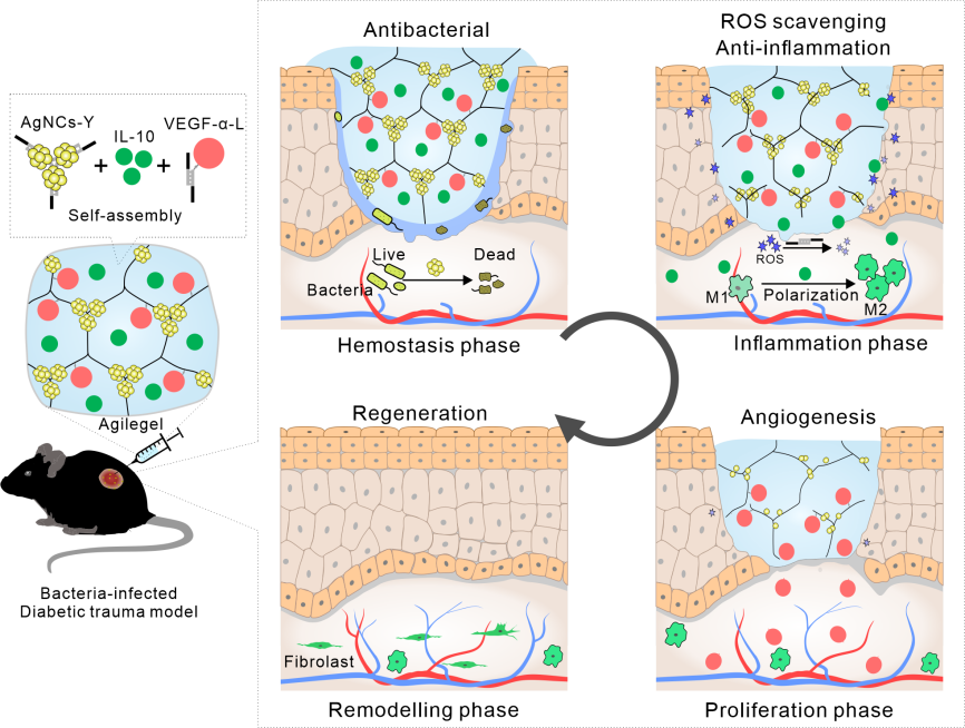 该工作利用DNA分子的可编程性以及不同的物理化学作用力,开发了一种多药有序释放的水凝胶Agilegel,用于促进糖尿病伤口愈合。该策略在DNA分子的磷酸骨架共价修饰血管内皮生长因子-α(VEGF-α)、富胞嘧啶区非共价形成纳米银团簇(AgNCs)、高级结构孔隙结构物理封装抗炎因子细胞介素-10(IL-10),不同作用力显著影响体内药物释放动力学。Agilegel水凝胶有序释放药物可以显著清除糖尿病小鼠伤口部位金黄色葡萄球菌感染和过量活性氧、有效促进巨噬细胞由促炎型M1向抗炎型M2极化,并加速细胞增殖、血管生成和细胞外基质形成,显著加速糖尿病感染性伤口的愈合。这项工作表明DNA水凝胶在发展用于复杂伤口和疾病的多药整合和分阶段干预治疗方面蕴藏了极大潜力。