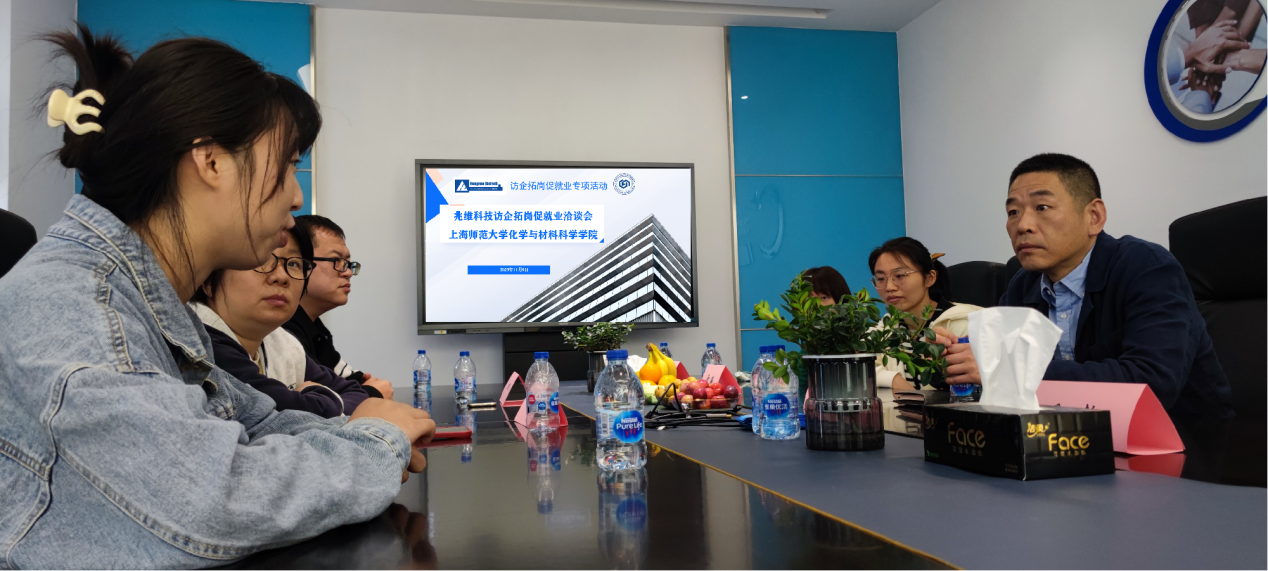 会上,我校2018届物理化学专业硕士毕业生、校友代表雷艳分享了入职后的工作经历和学习成长情况,如团队氛围十分活跃,带教领导十分热心,职业前景十分可观等。此外,两位研究生毕业生向兆维科技副总经理甘正霖、行政人事副经理张琪以及部门经理孙静咨询了公司的人才培养状况、具体工作内容以及职业发展潜能等相关问题。