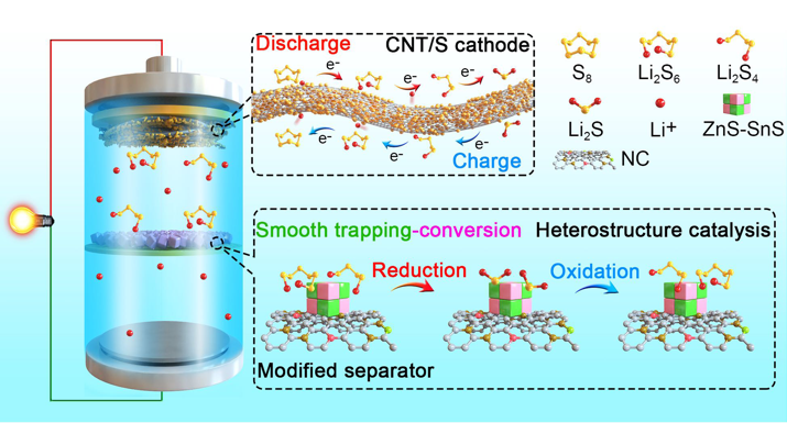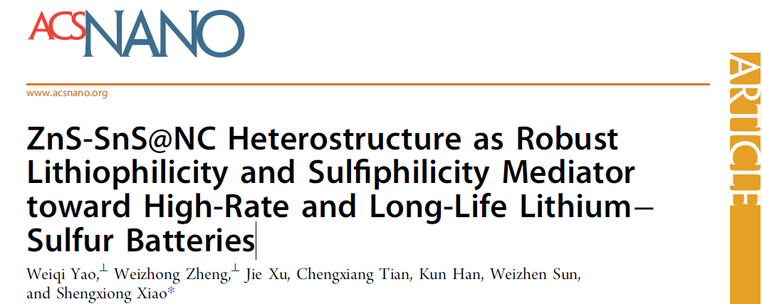 资源化学教育部重点实验室肖胜雄教授团队在锂硫电池研究领域取得新进展,相关成果近日在国际知名期刊《ACS Nano》上在线发表,论文题为“ZnS-SnS@NCHeterostructure as Robust Lithiophilicity and Sulfiphilicity Mediator toward High-Rate and Long-Life Lithium–Sulfur Batteries”。论文第一作者为成人影院 姚伟奇师资博士后和华东理工大学郑伟中博士后,通讯作者为成人影院 肖胜雄教授。