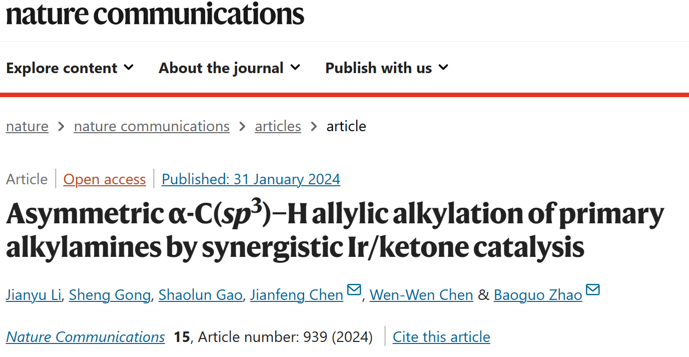 近期,化材学院赵宝国教授、陈剑锋副研究员团队在羰基催化伯胺α-C-H不对称官能化研究中取得重要进展,在《Nature Communications》上发表题为 “Asymmetric α-C(sp3)−H allylic alkylation of primary alkylamines by synergistic Ir/ketone catalysis”的研究论文。该研究运用酮/铱协同催化策略,成功地实现了烷基伯胺α-C-H键的不对称烯丙基烷基化反应,为具有重要生理活性的手性胺类化合物提供了高效便捷的合成新方法。2019级博士研究生李健羽为论文第一作者,赵宝国教授和陈剑锋副研究员为论文通讯作者。