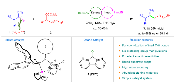 赵宝国课题组在前期发展的仿生羰基催化的基础上,成功开发了一种新型的羰基催化剂——1,8-二氮-9-芴酮 (4),运用酮/铱协同催化的策略,无需对NH2基团进行保护,在温和条件下成功地实现了烷基伯胺α-C-H键的不对称烯丙基烷基化反应,以良好的收率和优异的对映选择性高效构建了一系列手性高烯丙基胺化合物。该研究突破了烷基伯胺α-C-H键的反应惰性(pKa ~ 57)制约,为羰基催化的发展和手性胺的合成提供了新的思路。