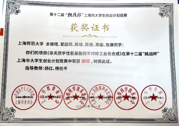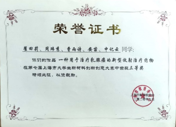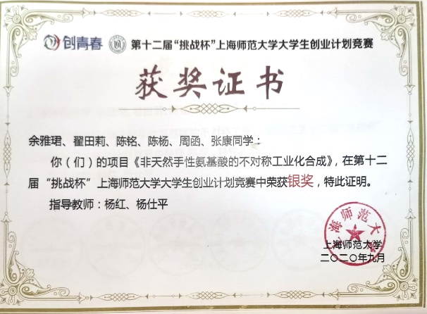 翟田莉,中共党员,2018级生物化工专业硕士生,曾任无机生化(研)党支部组织委员。师从杨红教授,研究方向为纳米生物学,读研期间完成学术论文4篇,其中SCIE期刊已发表论文2篇,另有两篇待发表,申请发明专利2项,主持完成成人影院 一流研究生人才培育项目和成人影院 学生科研项目各1项。先后获得研究生国家奖学金、学业一等奖学金,成人影院 “优秀学生”、成人影院 “三八红旗手”等荣誉称号,获得“华为杯”第十六届中国研究生数学建模竞赛全国三等奖,中国化学会优秀墙报奖,第七届上海市大学生新材料创新创意大赛市级三等奖,第十二届“挑战杯”大学生创业计划竞赛上海市铜奖、校级银奖,第六届中国国际互联网+大学生创新创业大赛校赛铜奖,第二届“慧源共享”全国高校开放数据创新研究大赛参赛奖等奖项。2021年,翟田莉同学获评“上海市优秀毕业生”。