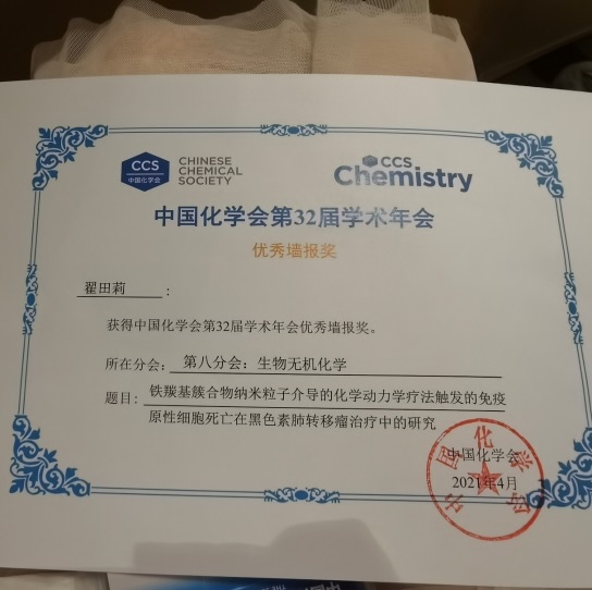 翟田莉同学深知科研没有捷径,唯有勤学苦思方能有所收获。进入研究生阶段后,她便勤奋努力,不断进步。她也迷茫过,彷徨过,一次又一次实验的失败让她不知所措,但她没有放弃,而是积极查阅文献,向师兄师姐请教,及时和导师讨论交流。导师的一句话让她至今记忆尤深:“只要思想不滑坡,方法总比困难多”。翟田莉同学说,正是因为杨老师不厌其烦的鼓励与指导,才使她有勇气在科研这条路上坚定地走下去。读研是一场修身又修心的旅途,可能会荆棘满布,但只要找到自己前行的方向,有一颗不断向前奋进的心,就一定会有所收获。这三年里,她的努力也终于得到了回报,她以第一作者在SCI一区TOP杂志ACS Applied Materials & Interfaces上发表论文一篇;以共同第一作者在SCI二区TOP杂志Chemical Communications发表内封面论文一篇,另有两篇学术论文正在修改投稿中。
