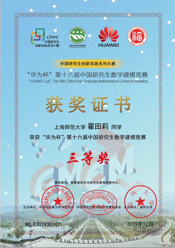 做实验、写论文之余,翟田莉同学也会积极参加各类竞赛,充实自己。一次偶然的机会,她和小伙伴们看到“华为杯”第十六届中国研究生数学建模竞赛的报名通知,觉得甚感兴趣,于是决定勇敢一试,开始了建模小白的学习进阶之路。但这条路远比想象中要困难得多,比赛时,由于不是专业选手,加之时间紧迫,她们连续工作了两天两夜,才最终完成了模型的建立和论文的撰写。在这次比赛中,她深刻明白了团队合作的重要性,古人云:“心齐,泰山移”。最终,她们在第十六届中国研究生数学建模竞赛国赛中斩获三等奖的好成绩。有了这次比赛的鼓励,翟田莉和她的伙伴们陆续在其他大大小小的比赛中收获颇丰。谈起参加这些比赛初衷,她说不想在以后回忆起研究生的三年,记忆里只有实验室。她想让自己的研究生生活更加丰富多彩,也想拓展自己的知识面,不断培养自己学习和接受新知识的能力。