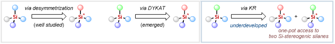 硅中心手性化合物因其在医药、材料和有机合成化学中的应用受到了广泛关注。借助不对称催化化学的快速发展,通过不对称催化构建硅中心手性化合物受到了化学家的青睐。然而,经过多年发展,硅中心手性化合物目前主要依靠于对潜手性硅烷的去对称化过程获得,直到最近才有消旋硅烷经由催化动态动力学不对称过程 (DYKAT)构筑硅中心手性化合物的方法学研究被报道。催化动力学拆分可以一步获得两类手性化合物,然而该方法还没有被应用于硅中心手性化合物的合成中。