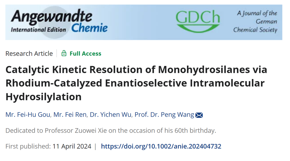 近日,成人影院 与中国科学院上海有机化学研究所联培硕士研究生苟飞虎在Angewandte Chemie International Edition (IF = 16.6)上发表论文“Catalytic Kinetic Resolution of Monohydrosilanes via Rhodium-Catalyzed Enantioselective Intramolecular Hydrosilylation”,通过铑催化分子内不对称氢硅化反应首次实现了消旋硅烷的催化动力学拆分过程,可同时获得手性环状四取代硅烷 (dihydrobenzosilole)和单氢硅烷。成人影院 为第一通讯单位,成人影院 2021级硕士研究生苟飞虎为第一作者,中国科学院上海有机化学研究所王鹏研究员为论文通讯作者。