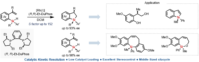 王鹏研究员课题组基于前期在催化不对称氢硅化反应构建含硅手性化合物研究的经验 (Angew. Chem. Int. Ed.2020, 59, 8937–8940; Angew. Chem. Int. Ed.2022, 61, e202113052),以商业可得的[Rh(cod)Cl]2为催化剂、(R,R)-EtDuPhos为手性配体,利用催化动力学拆分策略一步高效和高对映选择性地获得了两类硅中心手性化合物,即环状四取代硅烷 (dihydrobenzosiloles) 和单氢硅烷。这两类含硅手性化合物均可进一步转化为其他手性分子,包括硅中心手性七元环状硅醚和八元环状硅烷,为硅中心手性化合物的构建提供了新的思路。