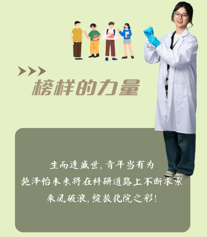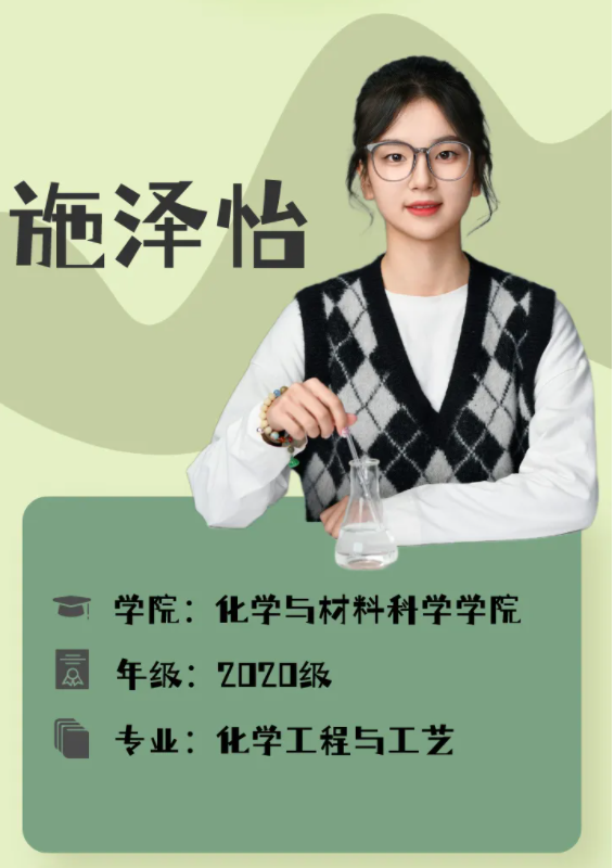 施泽怡在学业方面表现卓越,完全凭借个人不懈的努力和持续的提升。她在大一和大二学年荣获了专业二等奖学金,在大三学年,她的综合测评成绩提升至专业榜首,学位课程全科优良,获得了国家奖学金、上海市化学化工类优秀学生奖学金以及专业一等奖学金。如今,施泽怡已经成功推免至天津大学攻读硕士研究生,继续追求她在学术道路上的更高目标。