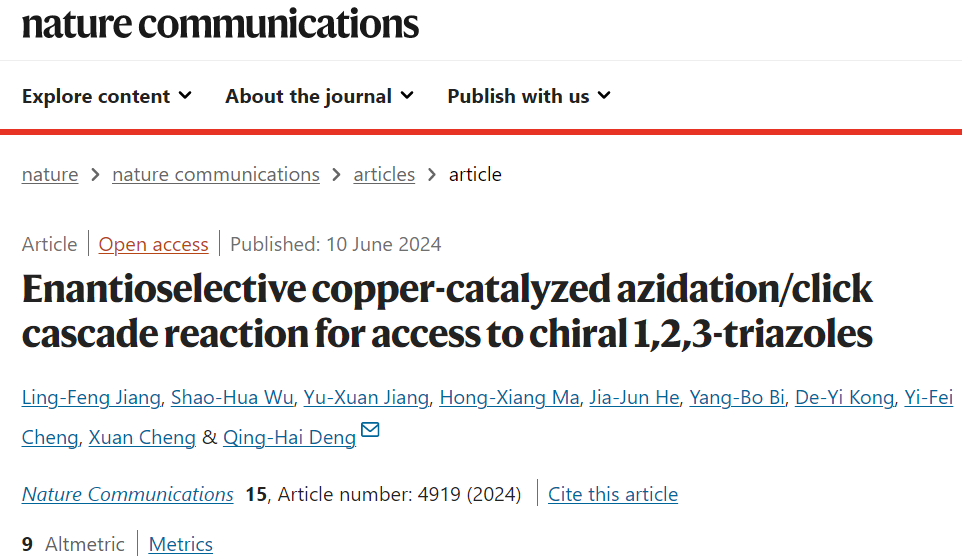 近日,学院邓清海教授团队在手性1,2,3-三氮唑化合物的合成研究中取得重要进展,相关成果以“Enantioselective copper-catalyzed azidation/click cascade reaction for access to chiral 1,2,3-triazoles”为题发表于《Nature Communications》。该方法通过巧妙的底物设计,结合不对称叠氮化与点击化学两种反应策略,通过串联反应实现了一系列1,5-二取代和1,4,5三取代手性1,2,3-三氮唑化合物的高效合成。成人影院 为唯一通讯单位,我校2020级博士生江岭峰为论文第一作者,邓清海教授为论文通讯作者。