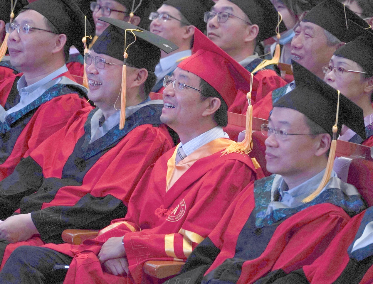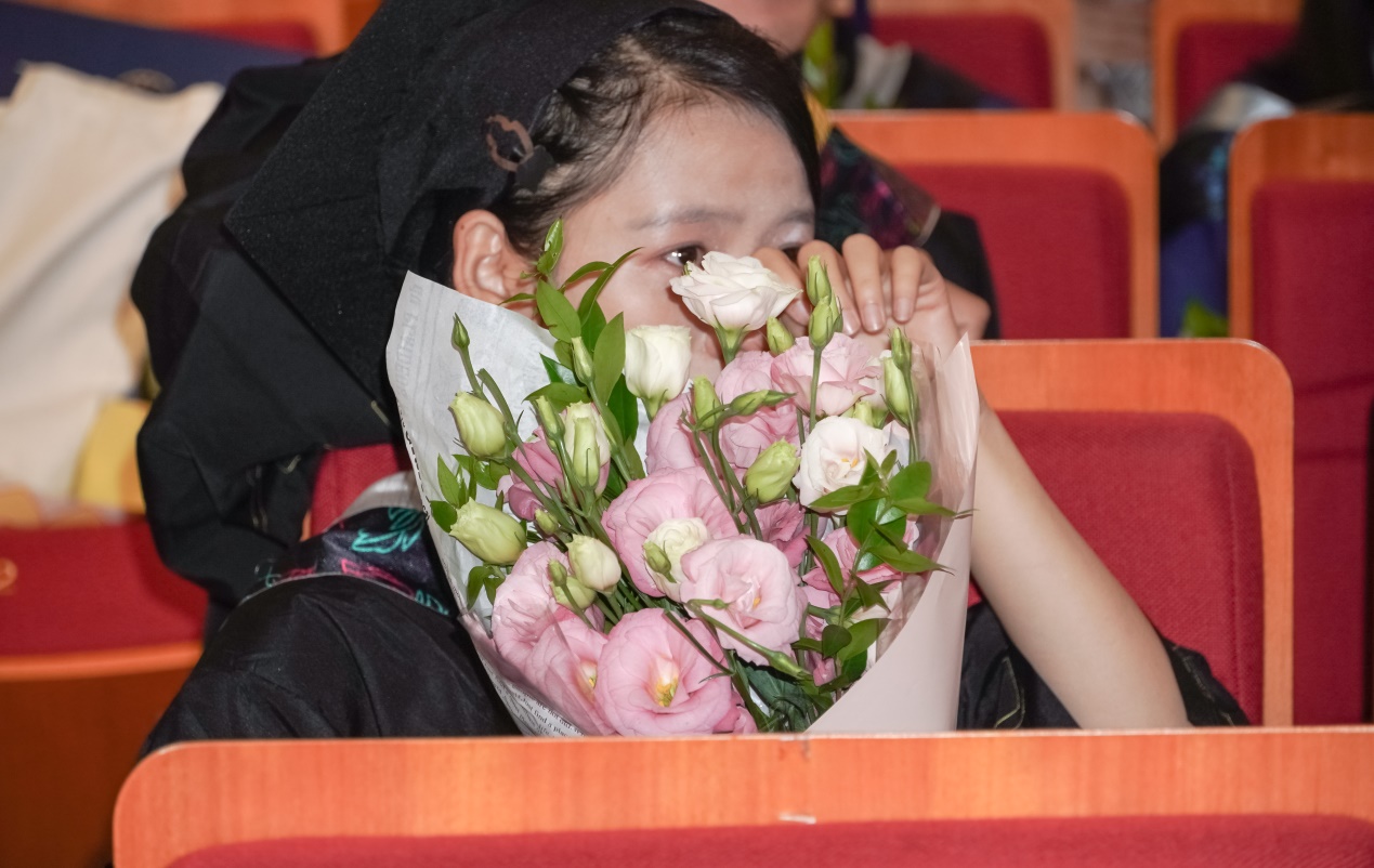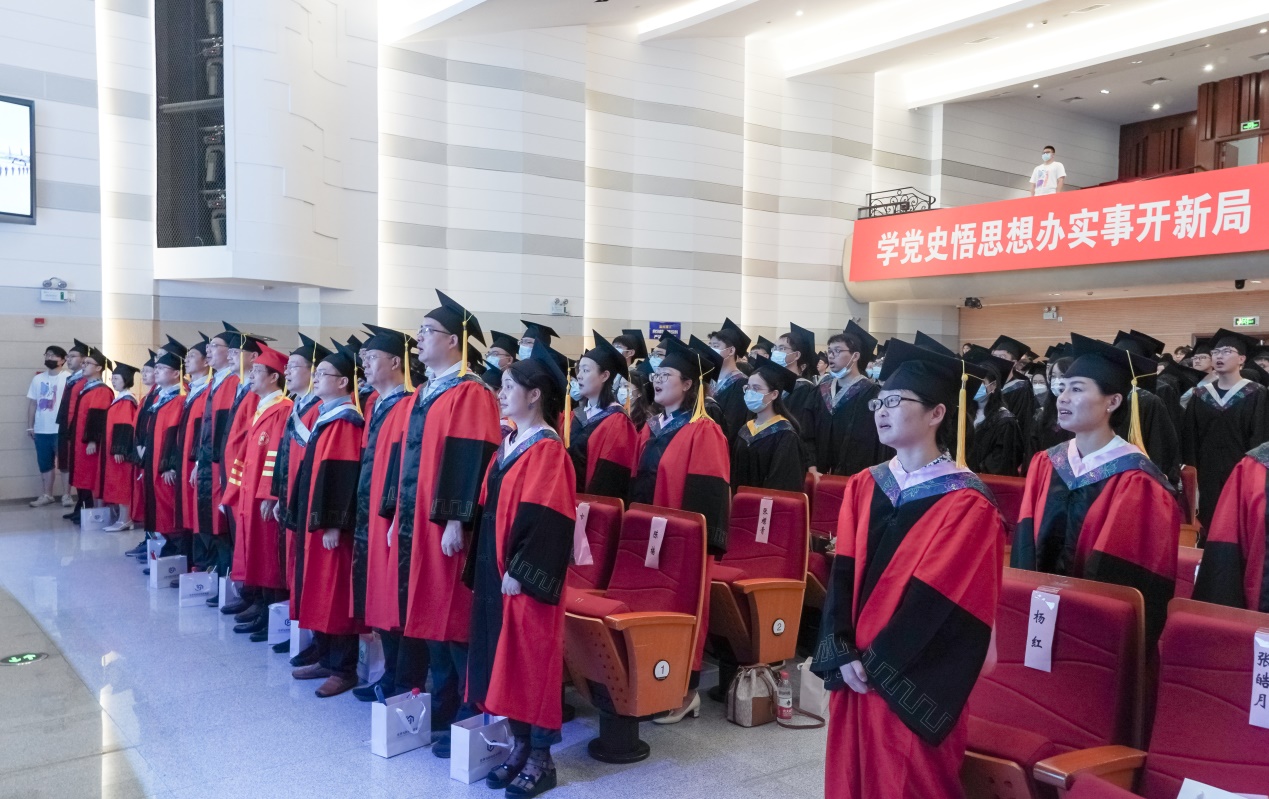 全体毕业生身着学位服入场完毕。老师与毕业生们全体起立,在庄严而嘹亮的国歌声中,毕业典礼拉开序幕。