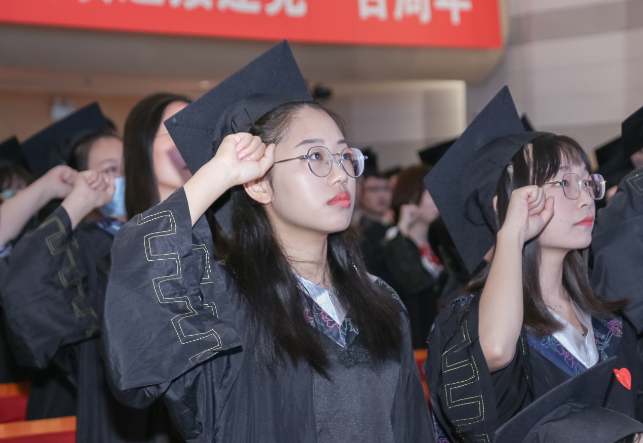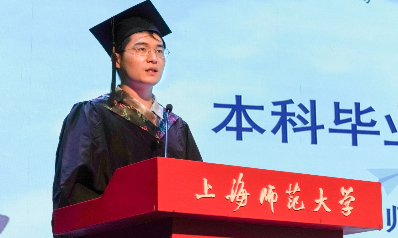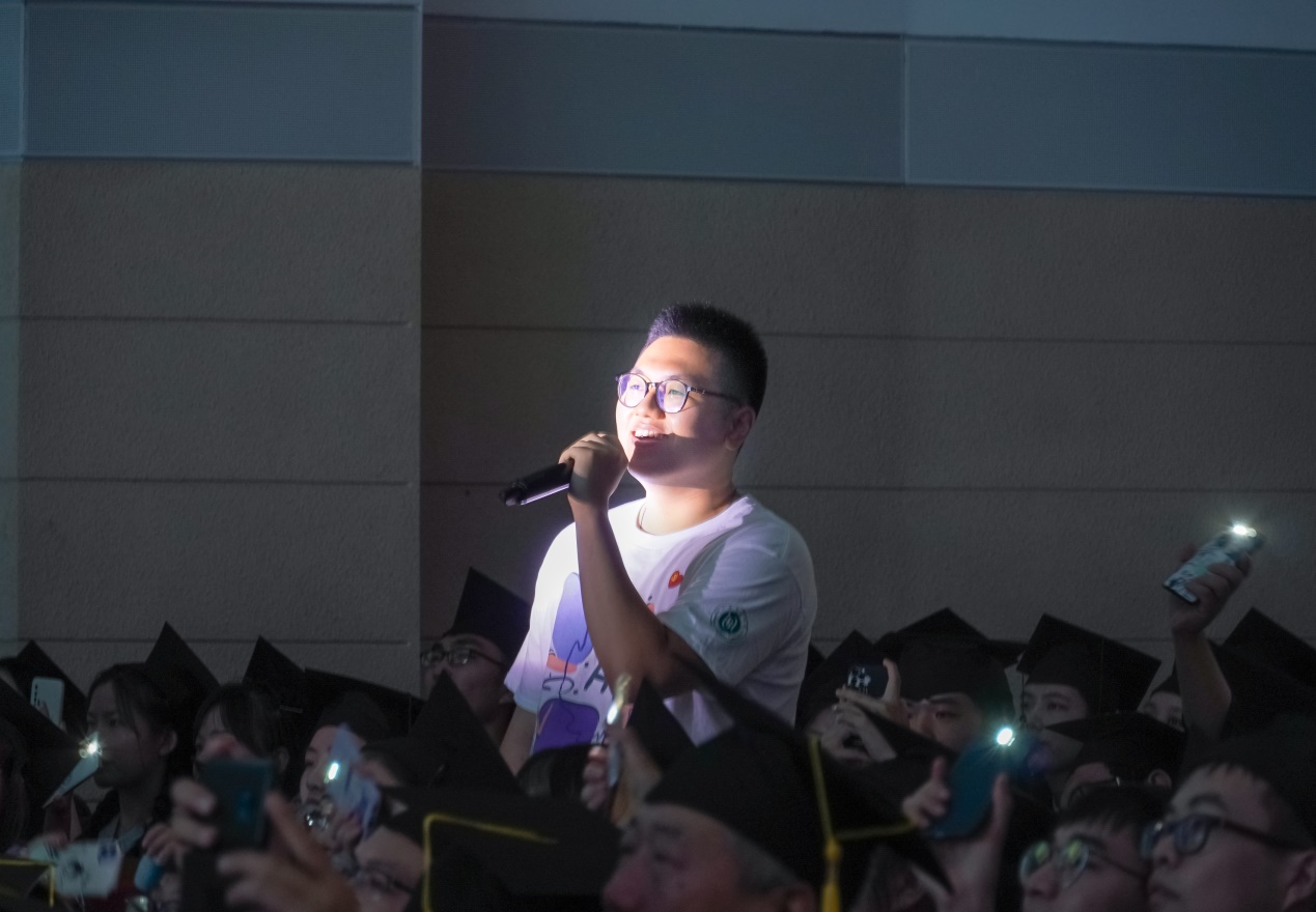 谢嘉阳同学代表本科毕业生发言。他说道:“大学的四年,我们刻苦学习,潜心科研,展现风采,我们一直在成长。我们恰逢建党百年之际毕业,让我们带着成长,也带着这份幸运和责任,昂首阔步踏上新征程。”