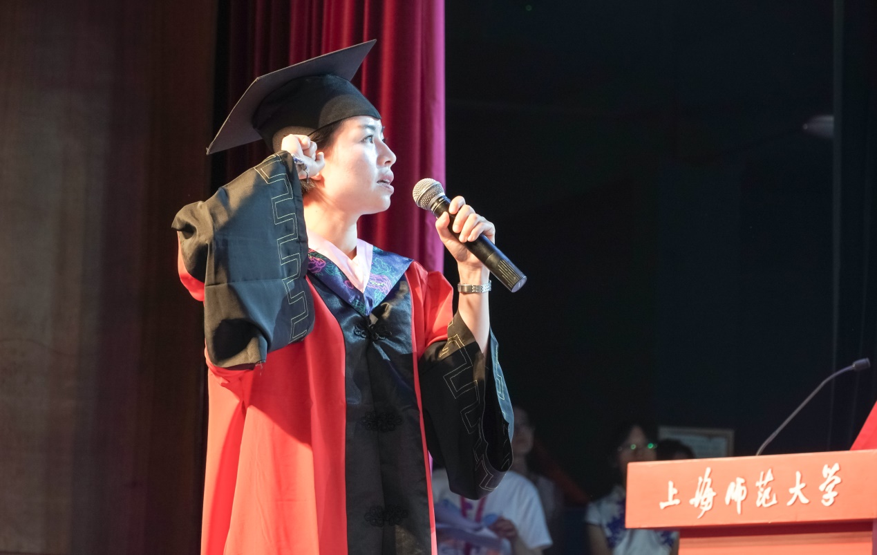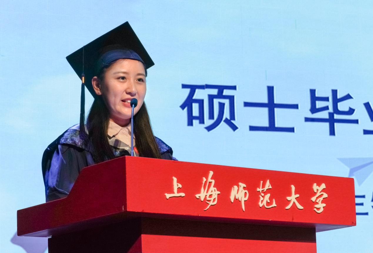 2021届上海市优秀毕业生翟田莉同学代表研究生毕业生发言。翟田莉历数了研究生三年中的点滴,对老师和同学表达了感谢之情,希望大家都能够积极向上,不忘初心,坚守信仰,并以习近平总书记寄语青年的话与同学们共勉,走出校门后,将努力为实现中华民族伟大复兴的中国梦贡献自己的青春力量!