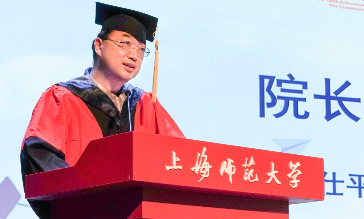 院长杨仕平老师致辞。杨老师从“初心少年遇见此去经年”、“青春华年遇见建党百年”“启程之年遇见开局之年”三个方面展开,指出毕业既是人生新起点的整装待发,更是时代号角下的豪迈出征,希望同学们能肩负祖国厚望,不负时代重托。