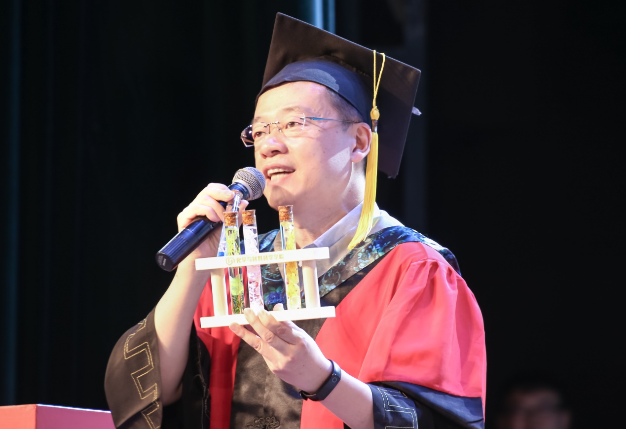 杨仕平老师将“钙”“铁”“锌”“硒”等化学元素赠予化材学子,希望同学们坚定理想信念,坚持终身学习,勉励同学们心怀敬畏、肩负责任、学会感恩,祝福同学们收获幸福快乐的人生。