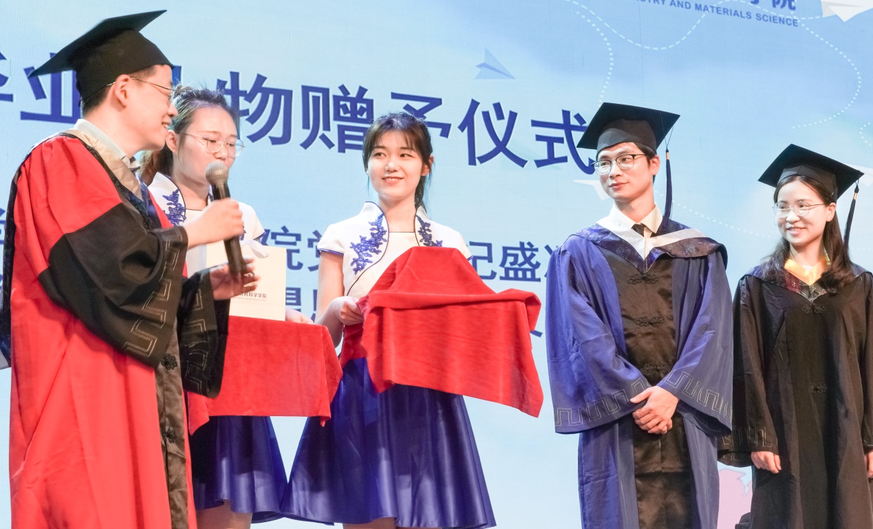 临别之际,学院为每名毕业生精心准备了一份专属的毕业礼物“化学之美,化学之变”。学院党委书记盛况老师上台为毕业生展示礼物,并向毕业生代表赠送礼物。希望这份小小的礼物,能捎去学院的不舍与期盼,陪伴化材学子们勇敢面对新的人生旅程。
