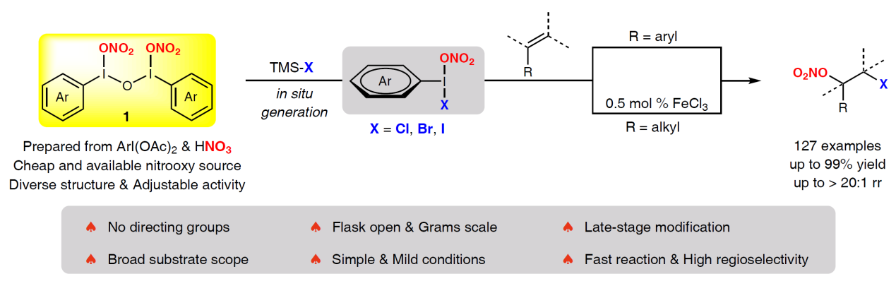 邓清海教授课题组长期致力于高碘试剂的发展和应用,主要包括高碘叠氮试剂(Nat. Commun., 2024, 15, 4919; Org. Lett., 2023, 25, 2739; Chem. Commun., 2023, 59, 7831; Org. Lett., 2019, 21, 7315)和高碘硝酸酯试剂(Angew. Chem. Int. Ed., 2023, e.202302521; Org. Chem. Front., 2020, 7, 3509)。在此基础上,发展了一种简单实用的未活化烯烃高区域选择性卤化-硝酸酯化反应新方法。该方法以自主研发的非环高碘硝酸酯试剂和市售的三甲基卤硅烷(卤原子可为:氯、溴、碘)为硝酸酯源和卤源,仅需0.5 mol%的氯化铁作为催化剂,即可实现烷基烯烃的高区域选择性卤化-硝酸酯化反应;芳基烯烃在无催化剂条件下,亦可实现高区域选择性的卤化-硝酸酯化反应。该方法实现了127例β-卤硝酸酯类化合物的合成(收率高达99%,区域选择性高达>20:1),显示出广阔的底物适用范围和良好的官能团耐受性。值得注意的是,一种衍生自乙烯的合成子2-碘硝酸乙酯能与多种官能团(氧-氢、氮-氢、硫-氢)顺利反应。采用本工作策略,可将硝酸酯基团直接或间接引入到阿司匹林、布洛芬、吲哚美辛、吉非罗齐、奥沙普秦、替米沙坦、维生素E、肽等药物分子或天然产物分子中,预期在有机合成及药物合成上有着潜在的应用前景。