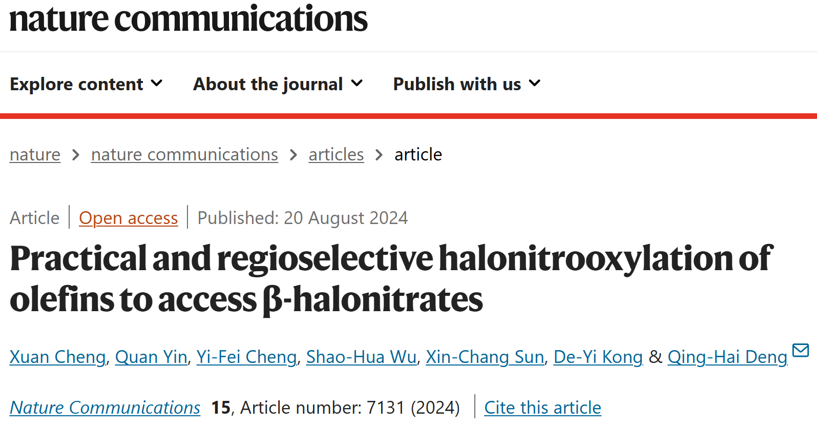 近日,成人影院 邓清海教授课题组在《Nature Communications》上发表论文“Practical and regioselective halonitrooxylation of olefins to access β-halonitrates”,发展了一种高区域选择性合成β-卤代硝酸酯的新方法。成人影院 为唯一通讯单位,2021级博士生成轩为论文第一作者,邓清海教授为论文通讯作者。