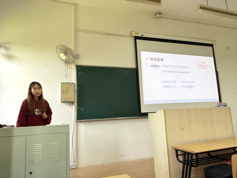 2023年度国家级“大创”优秀结项的负责人、2021级化学(师范)顾思杨为同学们介绍“大创”对提升科研探索能力和团队协作能力的重要意义,详细讲解课题实施过程中的准备工作、材料撰写、立项答辩、结项考核等环节的重难点。随后,他进一步分享参加“挑战杯”、“互联网+”等比赛的经验,强调组建交叉学科背景团队的重要性,并展示商业计划书的写作技巧。