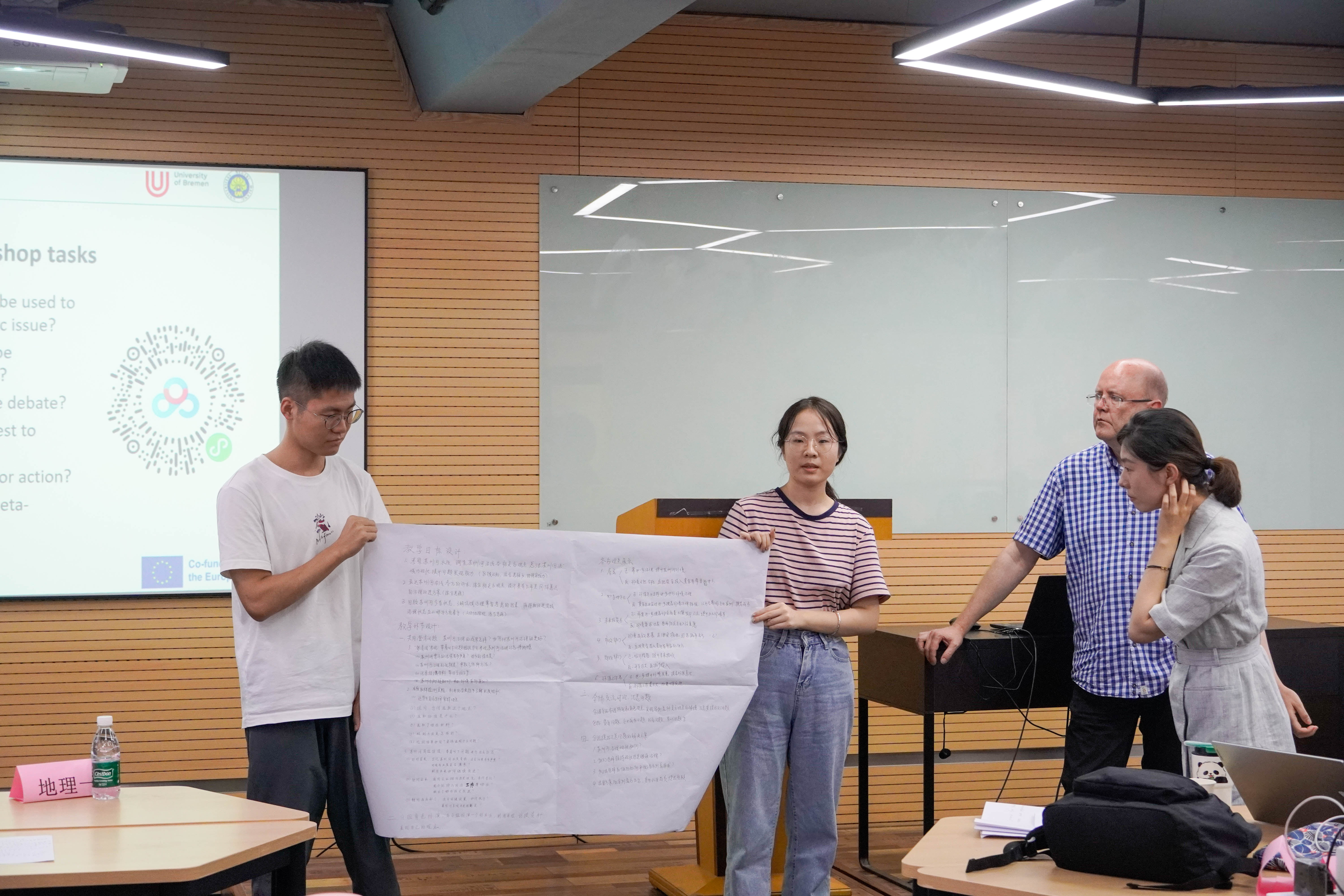 第二天,Eilks 教授综合强调了跨学科融合理念,介绍了地理与化学学科课程融合的教学实例,即磷酸盐回收议题作为可持续发展教育中跨学科的SSI 科学教育的典型案例。之后,师生在Eilks 教授的指导下进一步修改和优化课例,关注评价策略、学生参与度和课堂管理技巧的部分。最终,各组成功设计并展示了完整的教学设计案例,且获得了非常积极的反馈。