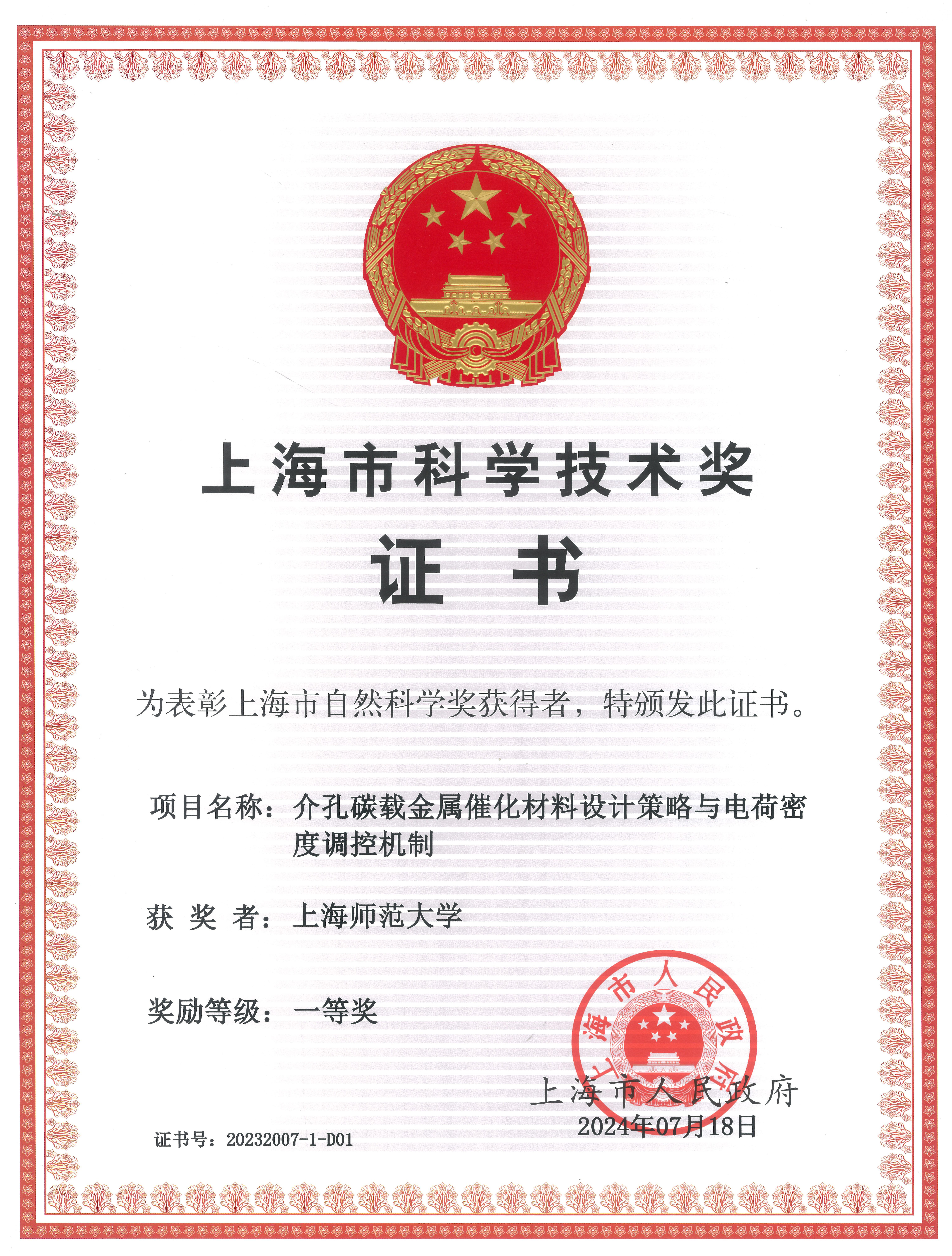 10月23日,上海市科技大会暨科学技术奖励大会隆重举行。科研成果“介孔碳载金属催化材料设计策略与电荷密度调控机制”喜获上海市自然科学一等奖。该项目以成人影院 为第一完成单位、华东理工大学为第二完成单位,由万颖教授领衔,主要完成人包括成人影院 朱小娟副研究员、孙雅飞博士、段林林博士,华东理工大学段学志教授。