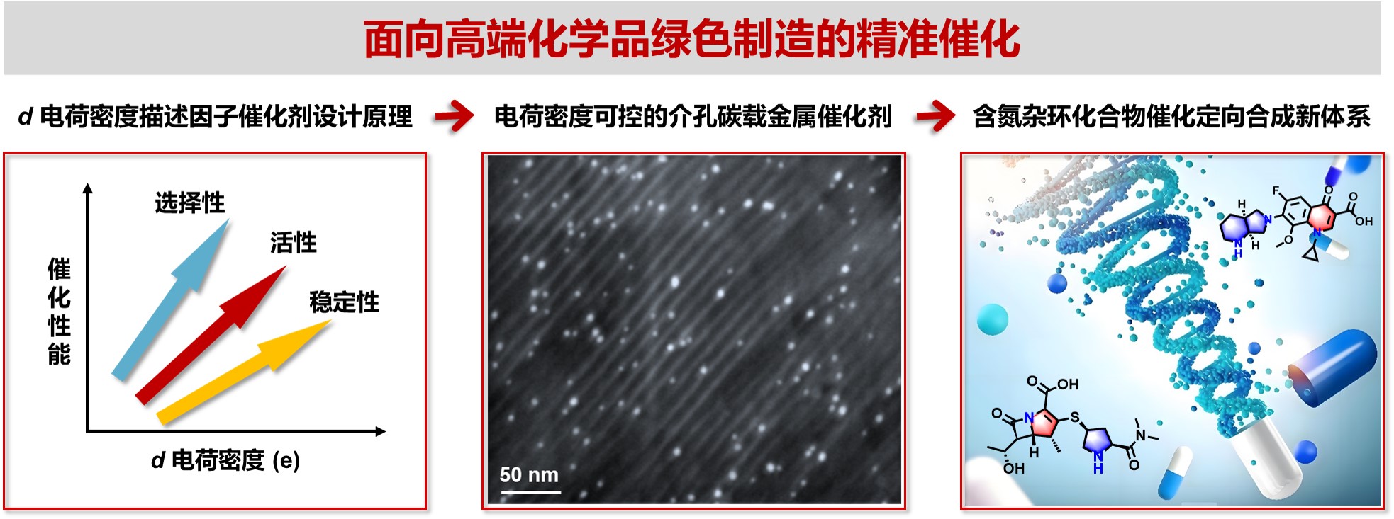 获奖项目“介孔碳载金属催化材料设计策略与电荷密度调控机制”针对高端精细化学品绿色制造重大需求,提出精准催化解决方案。率先为高性能碳载金属催化剂设计提供了金属d电荷密度主控结构描述因子新方法,变革了经典试错法开发催化剂的路线;提出了配位组装介孔催化材料制备新策略,建立了金属电荷密度的系统调控方法;构建了含氮杂环化合物催化定向转化新体系,突破了传统碳载金属催化剂性能。