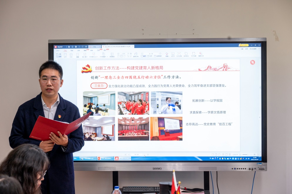 第二批全国高校“百个研究生样板党支部”——东华大学化学化工与生物工程学院“筑梦榜样”生物楼研究生党支部副书记王哲、组织委员贾兵洋同学,应邀分享党支部建设经验。贾兵洋同学从“强化组织建设、健全领导班子新局面,创新工作方法、构建党建育人新格局,传承红色基因、拓展铸魂育人新深度,推动交流交融、做强联建联育新广度,围绕育人特性、做强党建引领新活度”等方面展开分享,介绍了党支部的工作经验和建设成效。