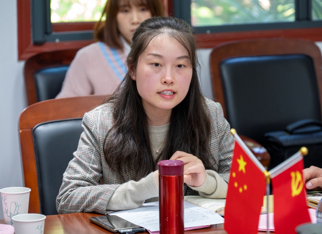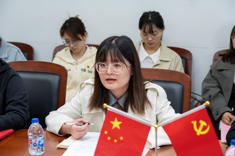 会议邀请学院2021届优秀毕业生党员翟田莉同学向学生党员们分享自身成长故事。翟田莉现为复旦大学博士在读,她回顾了自己研究生期间担任党支部组织委员的工作经历,介绍了自己读研期间科研经历和成绩,分享了自己参加志愿者服务、无偿献血等活动的亲身经历和感受。“星光不问赶路人,时光不负有心人”,翟田莉同学勤于思考,敢于创新,坚持全心全意为人民服务,是学生党员的榜样。最后翟田莉同学寄语学弟学妹,“要积极向上、不忘初心、坚守信仰、砥砺前行,为成为一名优秀的共产党员而不断努力”。