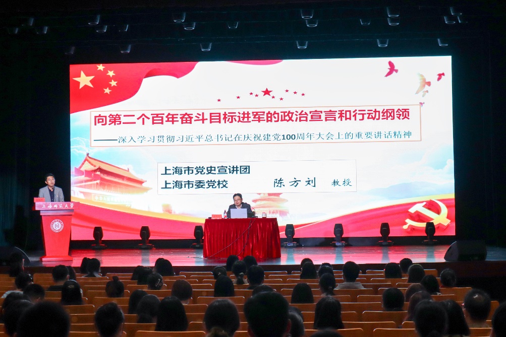 会议邀请上海市党史宣讲团、上海市委党校马克思主义学院副院长陈方刘教授,以“向第二个百年奋斗目标进军的政治宣言和行动纲领——深入学习贯彻习近平总书记在庆祝建党100周年大会上的重要讲话精神”为题,为全体党员做专题报告。陈方刘教授指出,习近平总书记“七一”讲话紧密围绕实现中华民族伟大复兴这一主题,结构严谨、气势恢宏,理论性、实践性都很强。