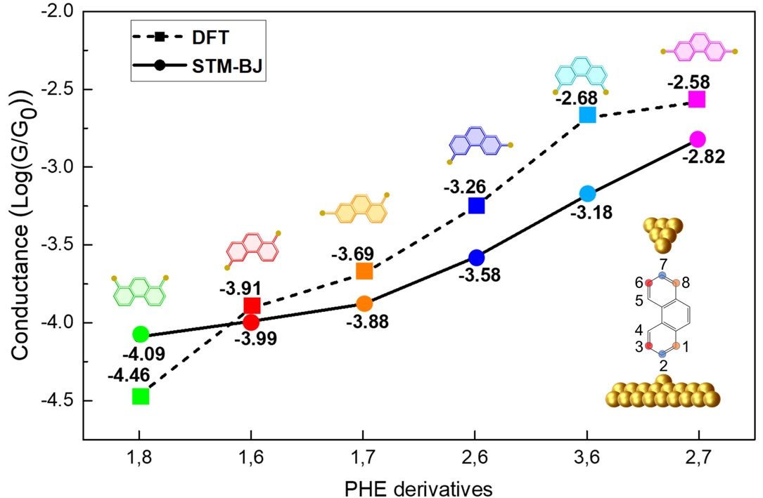 DFT计算结果与实验测量数据吻合良好,从理论上解释了相同骨架的六种菲分子的单分子电导之所以产生巨大差异是分子轨道能级排列、电子耦合和量子效应共同作用的结果,即因为取代基团位置不同,会导致分子能级发生变化,同时也使得分子与金电极间的电子耦合有所不同,进而对电子传输产生影响。该工作提出了一种简便可行的单分子水平上对分子导线的电导进行调控的方法,为石墨烯纳米带在碳基芯片领域的潜在应用提供了新的策略和理论指导。