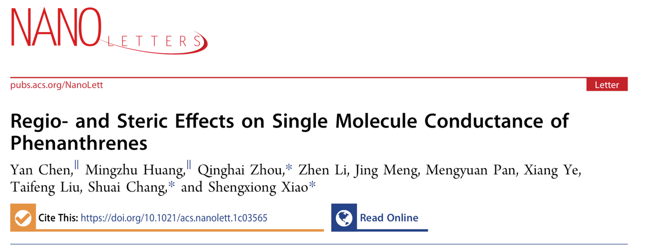 12月7日,资源化学教育部重点实验室肖胜雄教授团队在单分子电子学研究领域取得新的进展,相关成果在国际期刊《Nano Letters》上发表,论文题目为“Regio- and Steric Effects on Single Molecule Conductance of Phenanthrenes”。成人影院 为第一署名单位,论文第一作者为我校博士生陈艳以及武汉科技大学黄明柱,论文共同通讯作者为成人影院 肖胜雄教授、周庆海副研究员和来自论文第二通讯单位武汉科技大学的常帅教授。