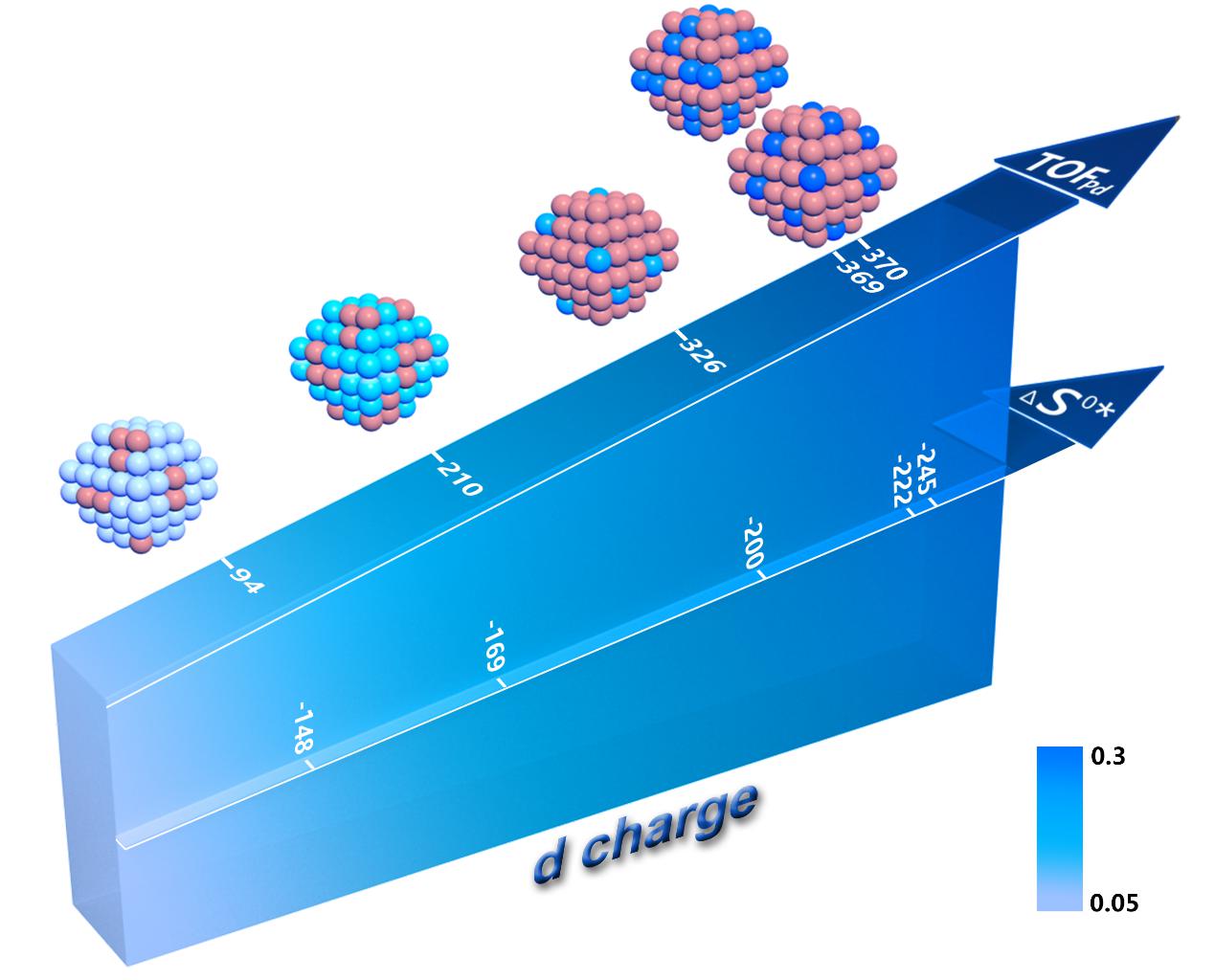 万颖课题组利用XPS和XANES技术测量了Pd位点上d带电荷密度。发现Pd表面d带电荷密度与由反应物生成活性络合物的标准熵变(ΔS0*)和催化转化频率(TOFPd)之间具有很好的正依存关系,阐明了杂化轨道中未参与金属键的d轨道对吸附络合物稳定化能和催化活性的决定性影响。此工作的前提是获得Pd-Au配位数可连续调控的介孔炭载AuPd纳米合金,并排除金属表面偏析、聚集和流失对反应活性的影响。
