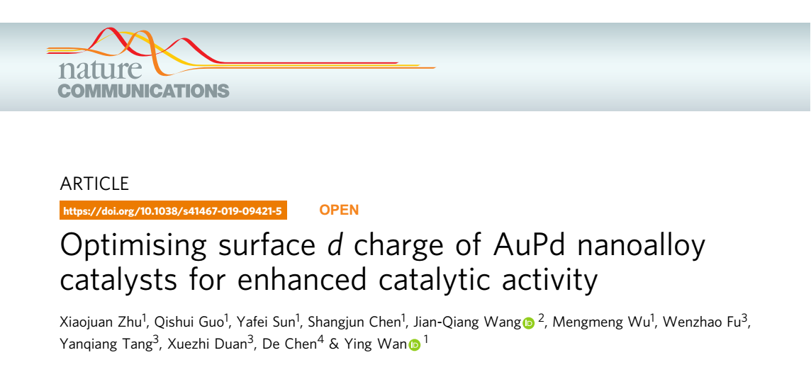 近日,成人影院 万颖教授课题组在Nature子刊Nature Communications上发表题为“Optimising surface d charge of AuPd nanoalloy catalysts for enhanced catalytic activity”的论文,发现了实验测量的金属表面d带电荷密度作为催化活性的描述符,为催化剂理性设计提供基础。