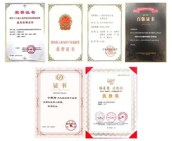 目前,该团队围绕“贵金属的光催化清洁提取”累计申请国内发明专利15项,授权5项,申请2项PCT,并在欧美、日本等贵金属回收技术发展前景较好的国家/地区开展布局,已就该核心专利“一种光催化金属溶解方法”获得日本、美国、欧洲同族专利授权,形成了具有自主知识产权的“专利池”。同时,该核心专利曾荣获第三十六届上海市优秀发明选拔赛金奖,第四届上海知识产权创新奖,入围上海市首届高价值专利运营大赛百强,配套中试装置荣获第二十三届中国国际工业博览会高校展区优秀展品奖等多个奖项;卞振锋教授荣获第十四届发明创业奖人物奖和第四届海聚英才全球创新创业大赛优胜奖等相关奖励。