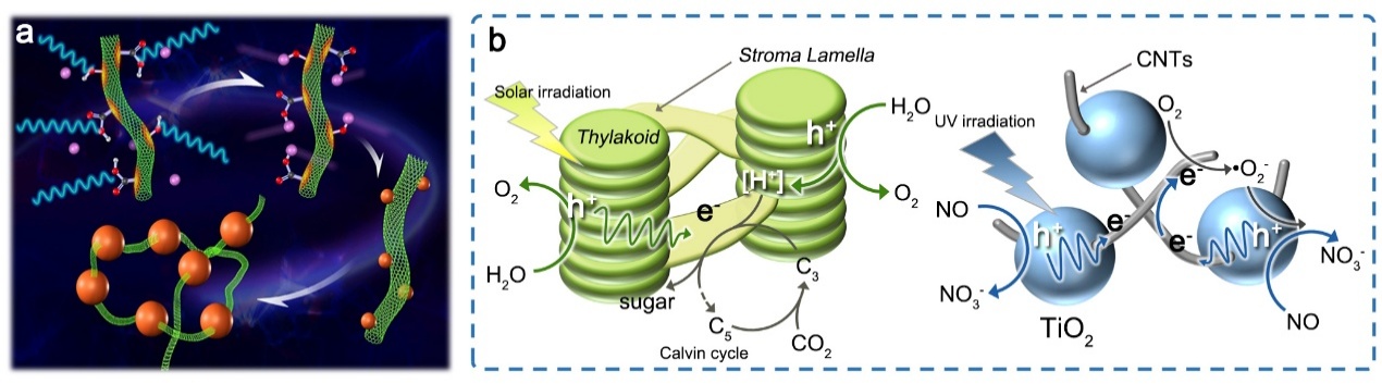 与2015年提出的微波在纳米金属上产生超热表面作用不同的是,该研究首次提出微波在碳纳米管上的限域超热点作用。大多数天然材料,由于其独特的微观结构和不同组分的协同效应,显示出惊人的性能。例如,叶绿体具有复杂的微结构,其中不同组分相互协同,使其成为光合作用的关键。从叶绿体结构中获得灵感,采用碳纳米管作为气固界面的微波吸收天线,合成了类叶绿体结构的碳纳米管非连续串联二氧化钛复合材料。由于串联结构中存在Ti-O-C等键合作用,TiO2上激发出的电子会高效转移到CNT上,并通过CNT 三维导电网络继续传递,实现氧化和还原反应的分离,并显示出高效去除一氧化氮污染物的活性、选择性和稳定性。通过对不同结构样品的对比,团队发现,类叶绿体的非连续串联结构催化材料优异催化性能的关键、在于构筑了双电子通道,即TiO2与CNT间的肖特基接触促进定向的电子传输以及CNT导电网络间的欧姆接触实现平衡电荷转移。