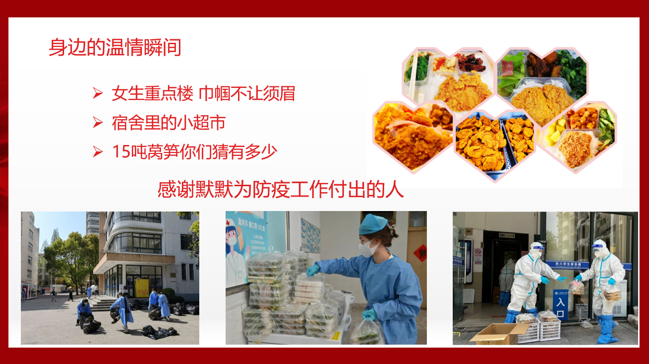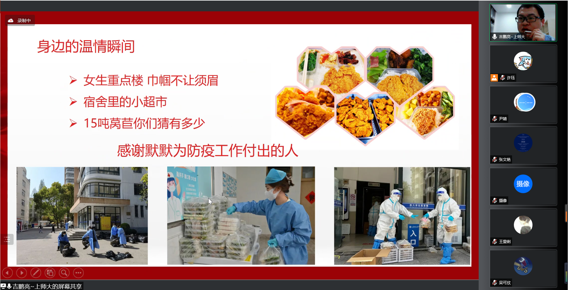 接着,吉老师为同学们讲述了校园战“疫”生活的温情瞬间。巾帼不让须眉的女生宿舍楼,辅导员张亚玲老师带领楼长、层长和志愿者们一起,共同守卫同学们的安全;西七楼长赵金鹏同学开在宿舍楼里的“小超市”,他每天一人负责统计一栋楼的物资采购意向,回答同学们的各种问题,严谨负责地做好“售后服务”工作;15吨莴笋驰援师大,食堂的叔叔阿姨、后勤人员加班加点地赶工,只为了让新鲜的蔬菜第一时间出现在同学们的餐盒中。