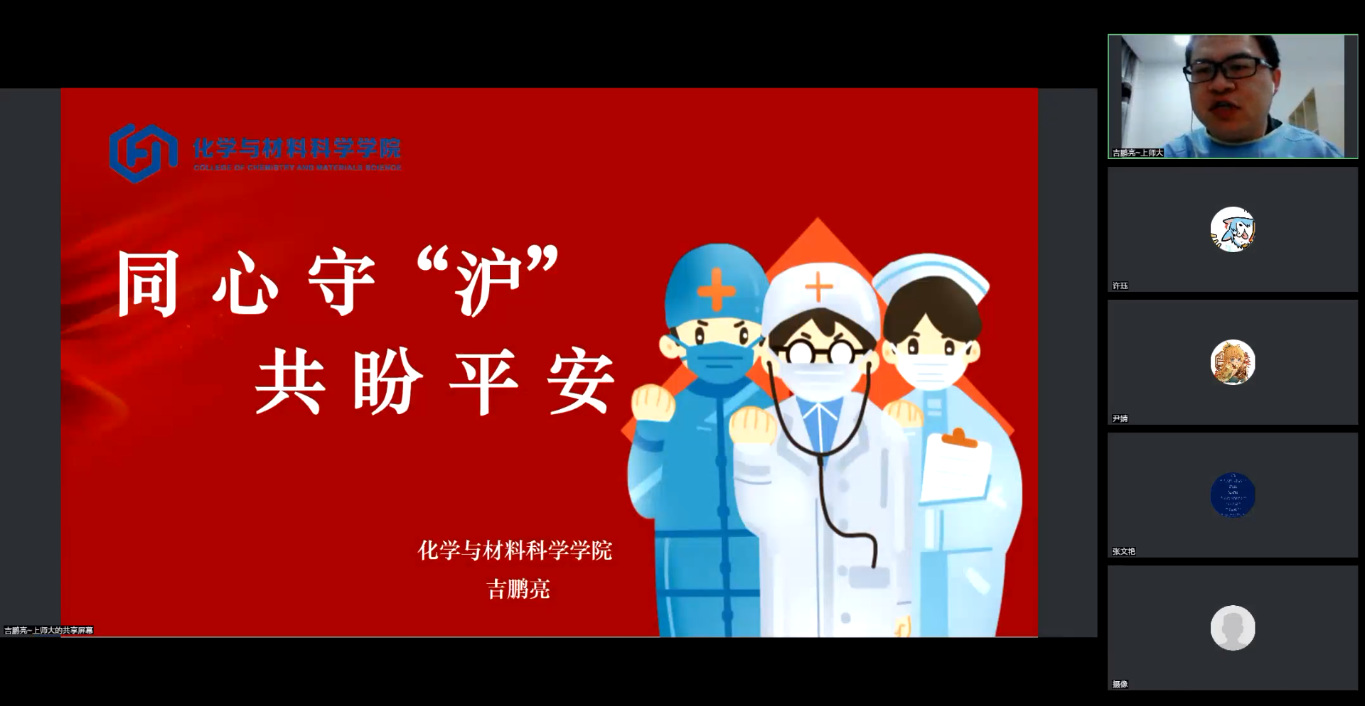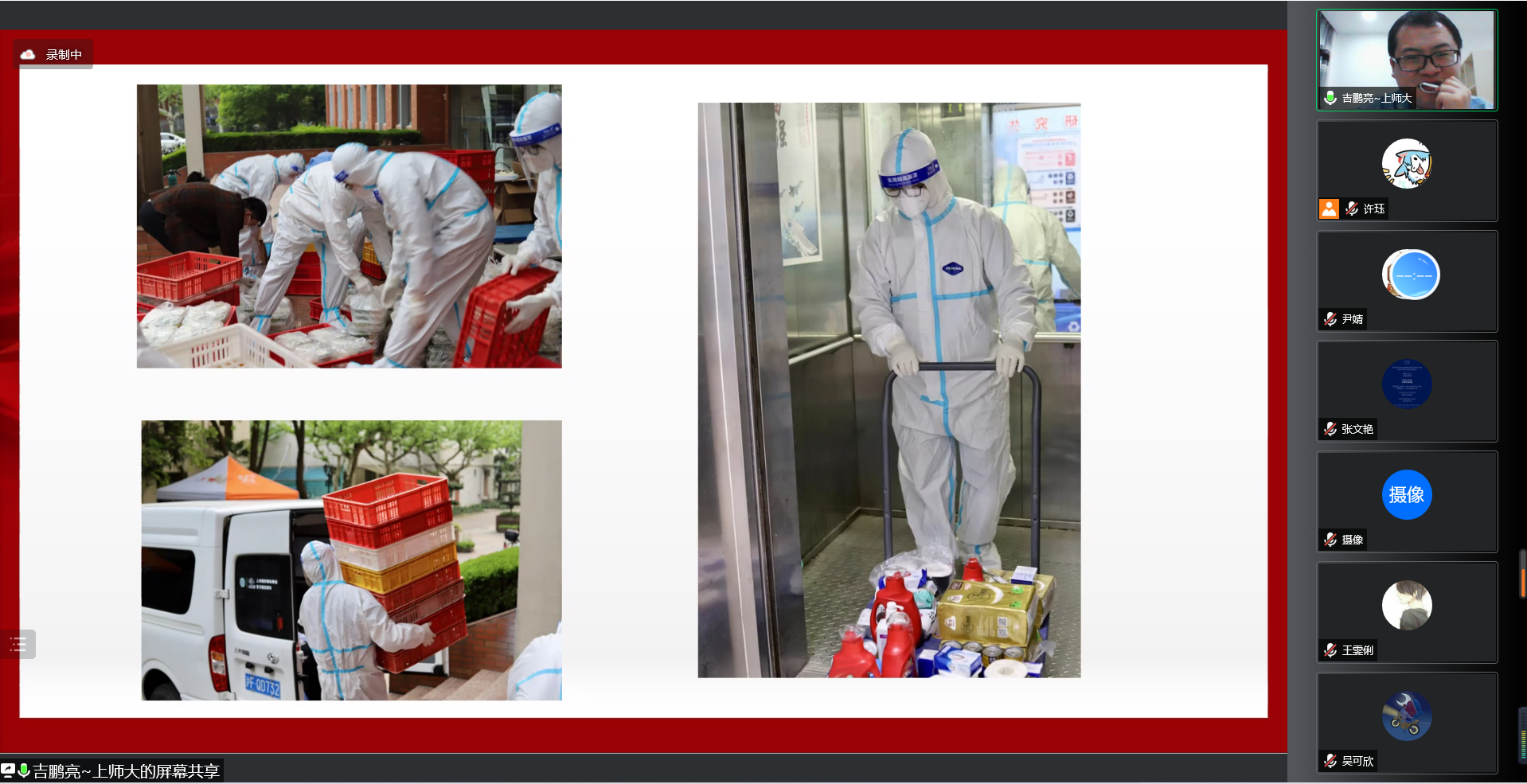 3. 研究生辅导员吉鹏亮老师向我们分享了他目前在徐汇校区疫情防控的情况。通过吉老师讲述他在西七宿舍楼工作时的压力和趣事,我深刻感受到疫情当下,老师、志愿者以及后勤工作人员的辛劳,是他们的默默付出和无私奉献,才保障了同学们的日常生活。每一个人的付出,都值得被我们尊敬!