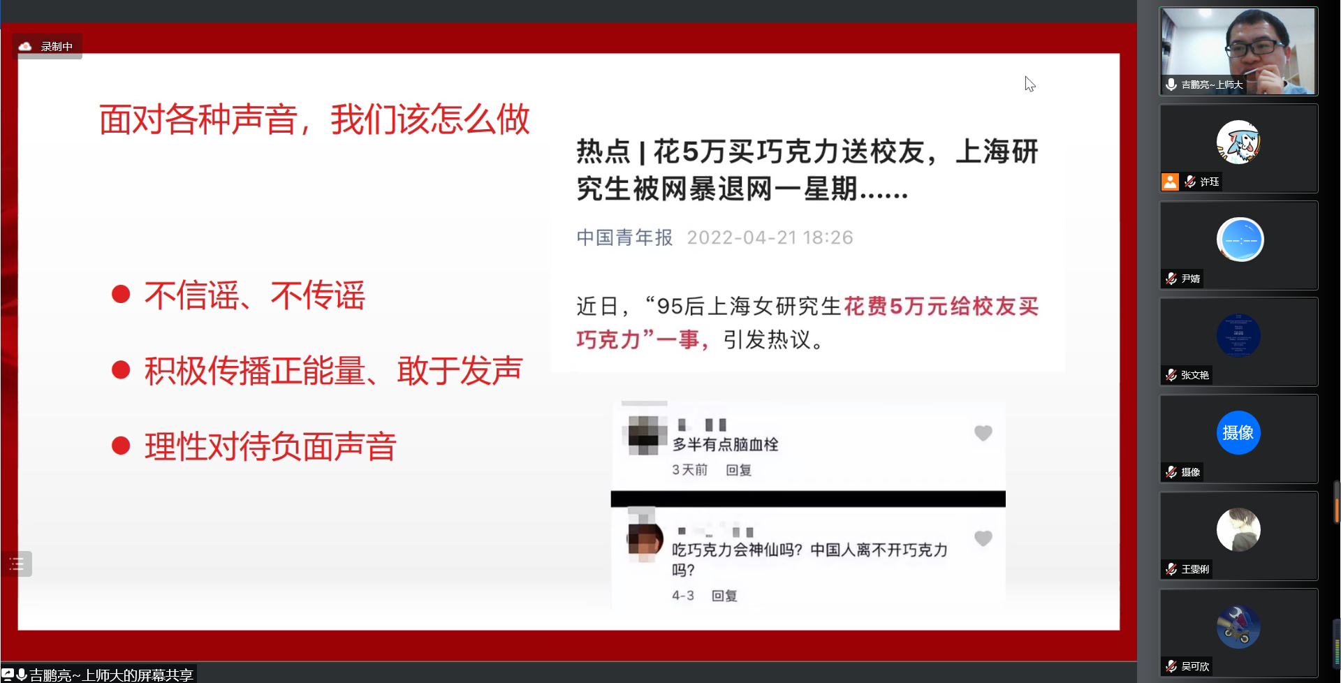 最后,吉老师结合“研究生学姐自费为在校同学购买巧克力”一事与同学们进行交流。希望同学们能够理性面对各种不同声音,不传谣、不信谣,敢于发声、勇于发声,积极传播正能量。最后,吉老师向大家提出倡议,希望大家能够科学防疫、积极防疫、理性防疫。只要我们携手同心,共克时艰,胜利终将属于我们!