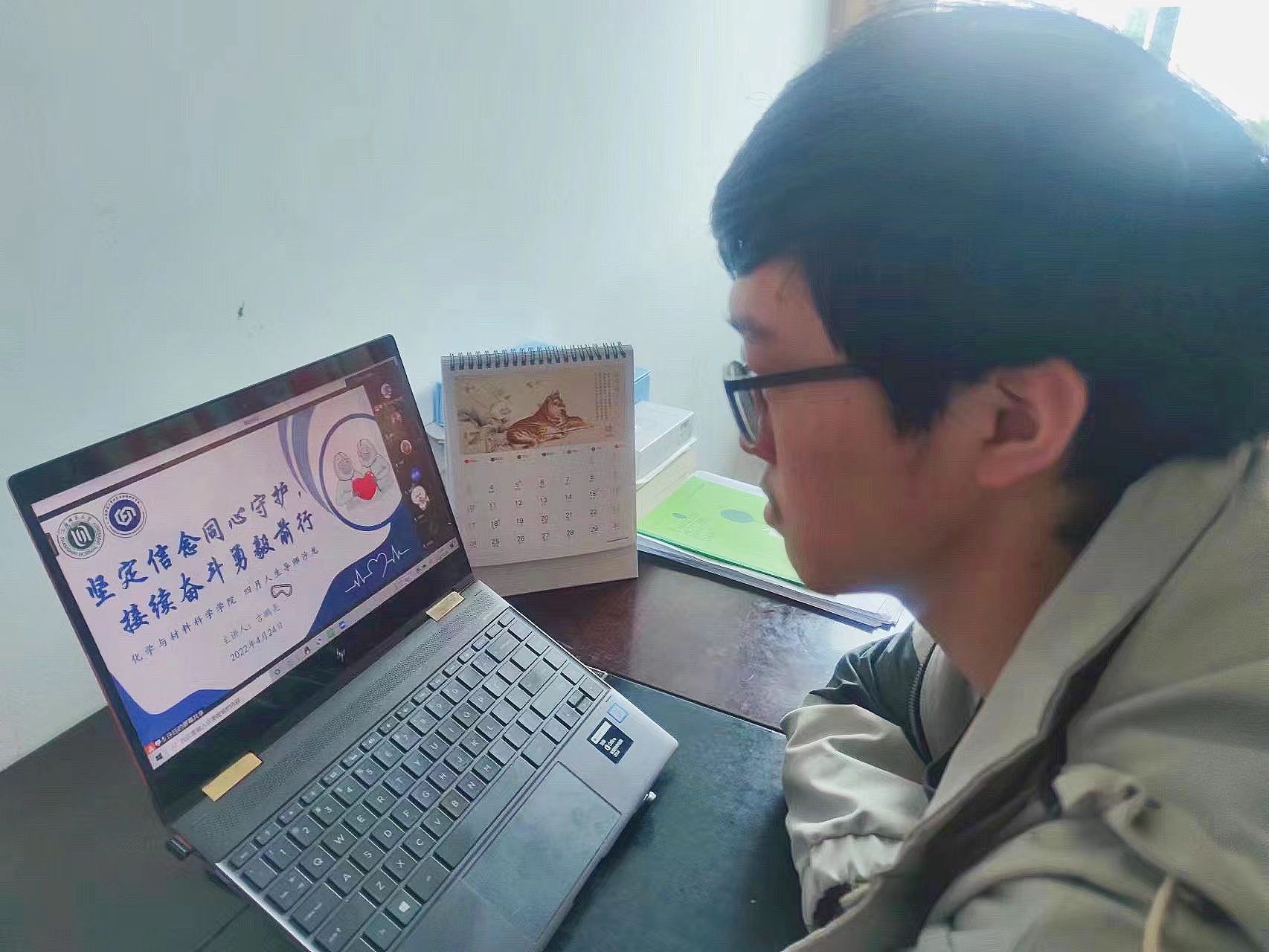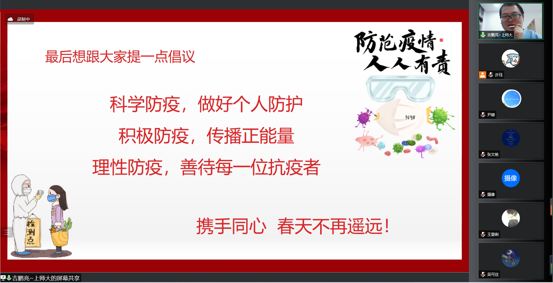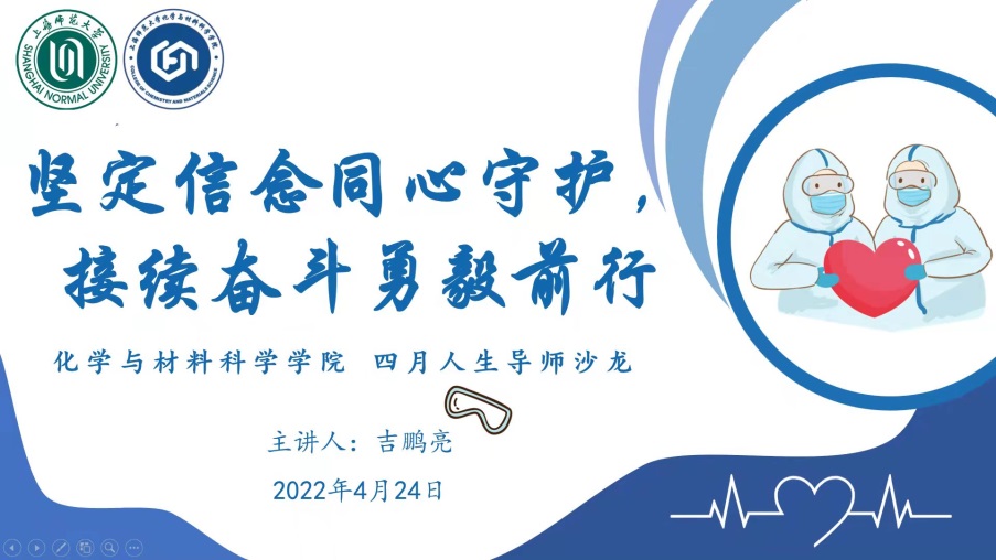 首先,吉鹏亮老师分享了自己入校40多天的战“疫”经历。上海疫情升级后,成人影院 所有辅导员老师第一时间离开了自己的家庭,投身徐汇、奉贤两校区的战“疫”一线,辗转在各个需要他们的地方,从寒冷的冬天奋战到绿意萦怀的盛春。吉老师为同学们分析了当日的疫情新增数据,从数据可以看出,目前疫情态势正在稳中向好,吉老师鼓励同学们要坚定信心、坚持不懈。