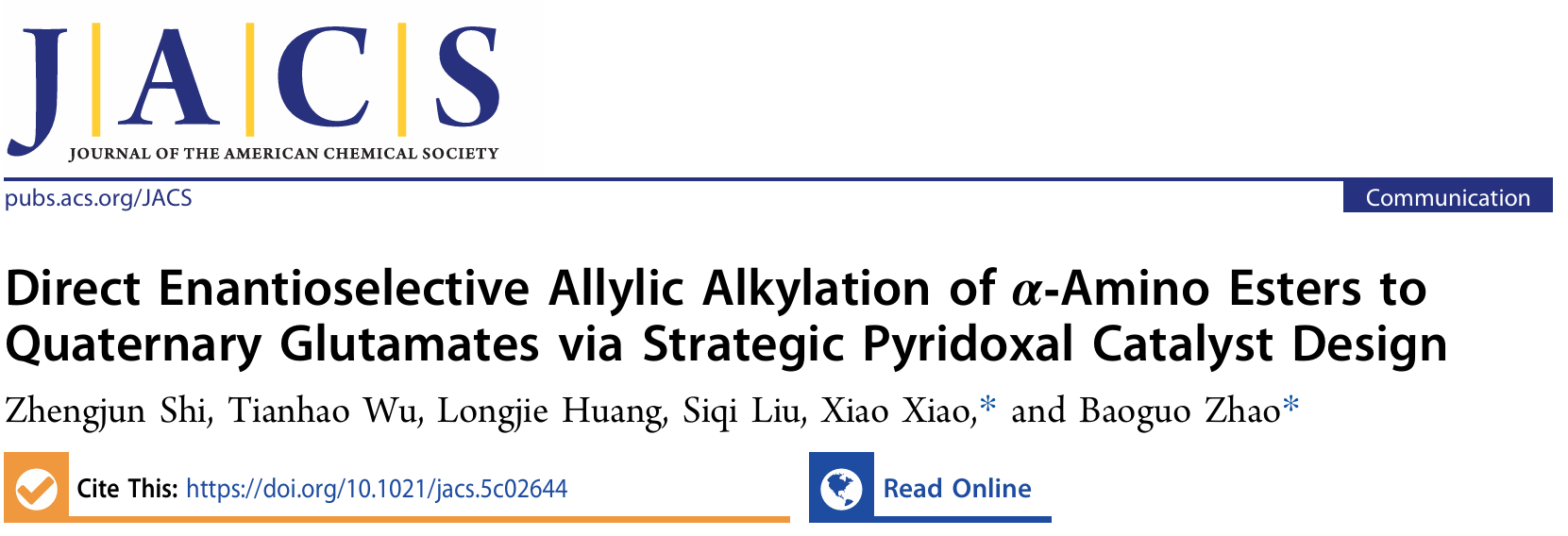 近日,成人影院 赵宝国教授和肖晓教授团队在维生素B6仿生催化领域取得新的进展。他们通过战略性设计新型中心手性吡哆醛催化剂实现了非保护的α取代氨基酸酯的直接不对称烯丙基烷基化反应,生成一系列药物和合成上十分重要的α季碳谷氨酸衍生物。相关成果以“Direct Enantioselective Allylic Alkylation of α-Amino Esters to Quaternary Glutamates via Strategic Pyridoxal Catalyst Design "为题发表在《Journal of American Chemical society》上。成人影院 为唯一署名单位,21级硕士生施政军为论文第一作者,21级应用化学拔尖班本科生巫天浩为论文第二作者,赵宝国教授和肖晓教授为论文共同通讯作者。