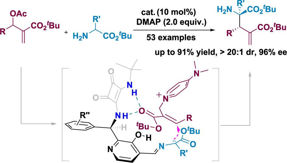 赵宝国教授和肖晓教授团队基于仿生羰基催化策略,设计并开发了一类全新的中心手性吡哆醛催化剂,该催化剂具有扩大的手性空腔和调控性强的立体结构,在温和条件下成功实现了未保护α-取代甘氨酸酯与MBH醋酸酯的直接不对称α-C烷基化反应,以良好的收率和优秀的立体选择性构建了一系列含有α-季碳手性谷氨酸衍生物。该研究展示了吡哆醛催化剂在不对称催化领域的强大作用,进一步丰富了吡哆醛催化剂的种类,拓展了基于维生素B6的仿生催化化学。