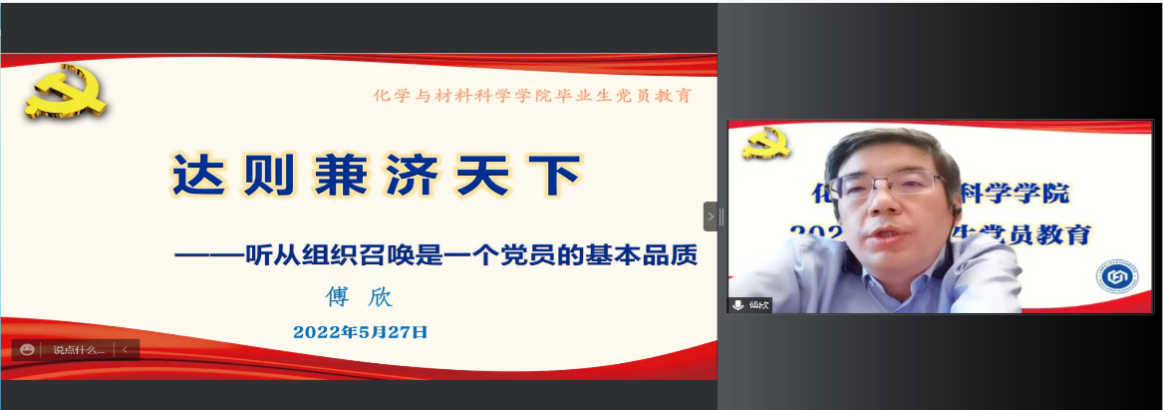 傅欣老师以《达则兼济天下——听从组织召唤是一个党员的基本品质》为主题对毕业生党员进行叮咛教育。他结合自身成长经历和援藏工作体会,给毕业生党员三个建议。一是要坚定理想信念,在进入社会后,要牢记党员的身份,时刻听从党组织的召唤。二是要逐步提高自己的工作能力。在面对困难和挑战的时候,要保持正确的立场,真正走进群众,解决群众的实际困难,赢得群众的信任从而形成更为强大的凝聚力和战斗力。三是毕业生党员要有胸怀天下的志气。要把自己的工作学习和国家的发展大势紧密联系在一起,达则兼济天下,矢志不渝,无私奉献。傅欣同志曾荣获全国脱贫攻坚先进个人,全国脱贫攻坚奖创新奖,全国最美支边人,全国教育系统先进工作者等荣誉称号。他的援藏经历与感受是对毕业生党员的最好教育。