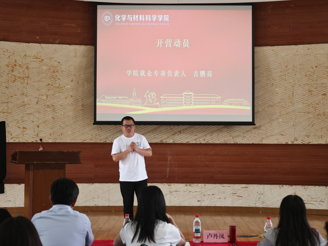 在开营动员中,学院就业专项负责人吉鹏亮老师介绍了学院近年在科研等方面的突出成果,勉励大家积极报考本校研究生,并针对实习就业提出了“提前规划、丰富经历、细致准备、及时反思”四点建议。