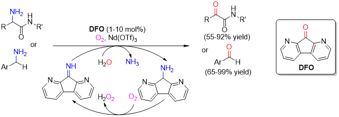赵宝国教授和陈剑锋副研究员团队模拟铜胺氧化酶,以商品化的1,8-二氮芴-9-酮(DFO)为催化剂,成功实现了α-氨基酰胺和苄胺的氧化脱氨化反应,在温和条件下以良好至优异的收率制备了多种具有生物活性的α-酮酰胺和芳香醛。深入的机理研究表明:该反应遵循与生物过程相似的催化路径,Lewis酸在该转化中加速了多个反应步骤。作为一种新型模拟铜胺氧化酶功能的有机催化剂,DFO具有结构简单、稳定性高和亲电性强等独特优势。本研究不仅开发了一种用于氧化脱氨的新型仿生有机催化剂,更为生物活性α-酮酰胺的合成提供了创新策略。