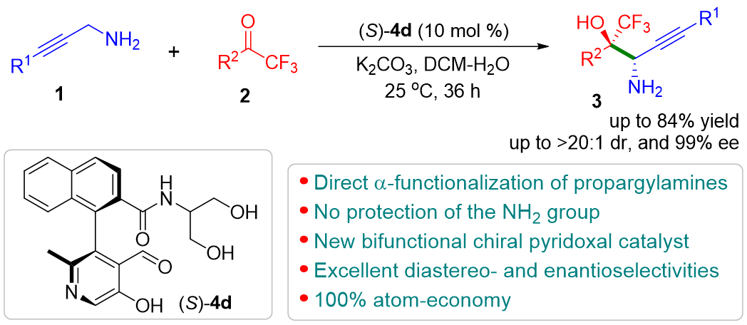 仿生催化是向大自然学习、模拟生物酶的化学催化策略,目的是综合化学催化和生物催化的优势,实现在环境友好的温和条件下,高选择性、高效率地合成目标产物。赵宝国教授与陈雯雯副研究员团队利用新开发的手性吡哆醛催化剂,运用仿生策略成功地实现了弱活化炔丙胺α-C-H键对三氟甲基酮的不对称加成反应,以良好的收率和优秀的立体选择性构建了一系列手性炔基取代的邻氨基醇类化合物。