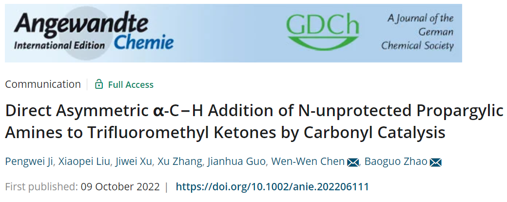 10月9日,上海市仿生催化前沿科学研究基地的赵宝国教授和陈雯雯副研究员团队在仿生羰基催化炔丙胺α-C-H键不对称官能团化研究中取得进展,相关成果以“Direct Asymmetric α-C-H Addition of N-unprotected Propargylic Amines to Trifluoromethyl Ketones by Carbonyl Catalysis”为题发表在《Angewandte Chemie International Edition》上。21级博士生季鹏伟为论文第一作者,成人影院 赵宝国教授、陈雯雯副研究员为论文共同通讯作者。