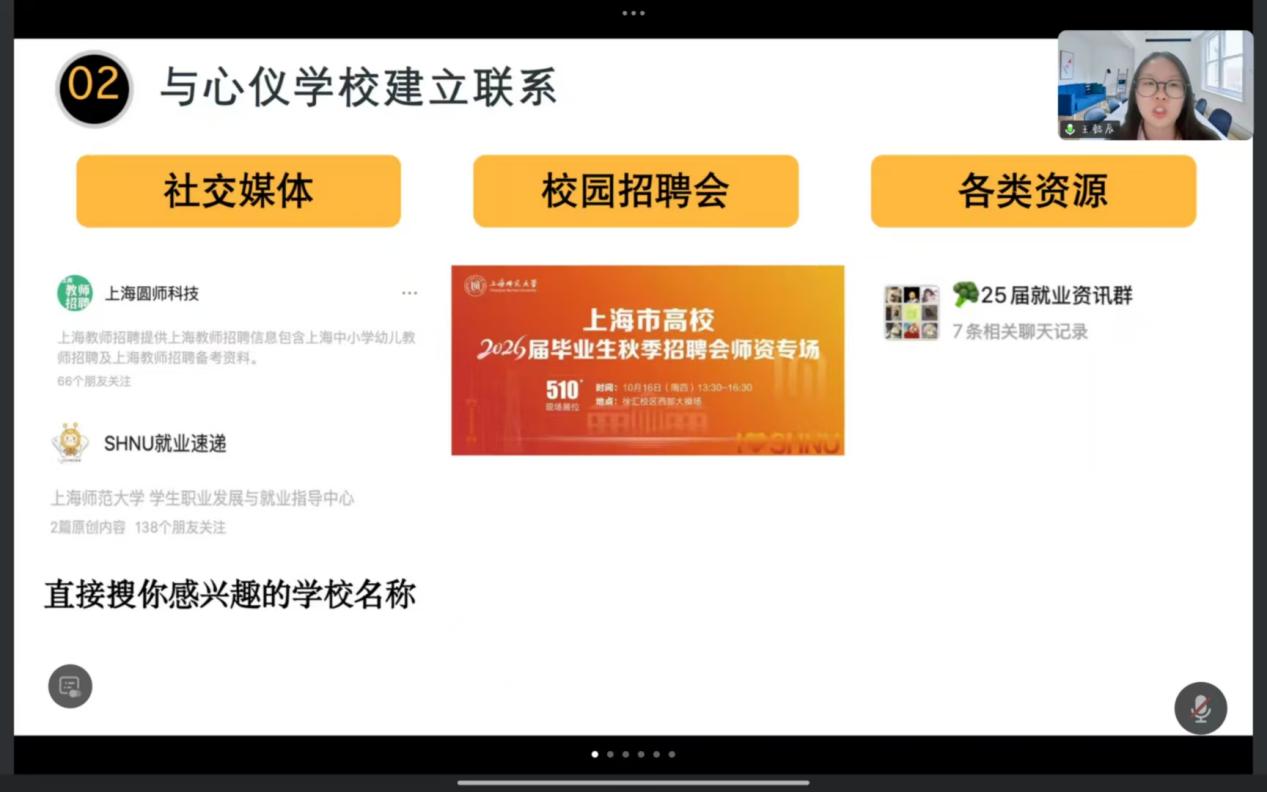 在目标学校确定上,她强调需紧盯官方渠道——教育局官网发布的岗位,同时结合通勤时间、校园环境、学校梯队、是否为集团化办学等因素综合筛选,并分享自制的“学校信息表格”,帮助同学们高效对比、精准定位。关于与目标学校建立联系,她推荐多渠道发力:通过社交媒体搜索学校动态、校园招聘会现场沟通、就业资源群获取内推信息,主动投递简历并标注“意向岗位”,提升沟通效率;获得学校初步认可后,需积极参与校自主组织的笔试、面试,明确表达求职意向,同步确认后续流程节点。