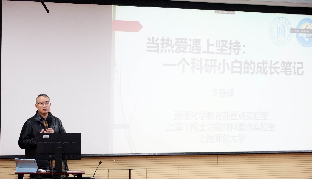 卞振锋教授以一段亲身经历切入,和同学们的科研初心产生了共鸣,紧接着他补充道,仅怀热忱是不够的,还需依托平台的支撑。随后,他详细介绍了上海师大成人影院 的优质资源:这里的国家级实验室、省部级科研平台,是科研新手也能上手的“入门工具”;导师团队会带着大家从“好奇试管里的颜色变化”,逐步成长为“能独立设计实验方案”的研究者;也是学生的热爱、平台的支撑和365天的坚持造就了他上海市优秀毕业论文第一名的荣誉。