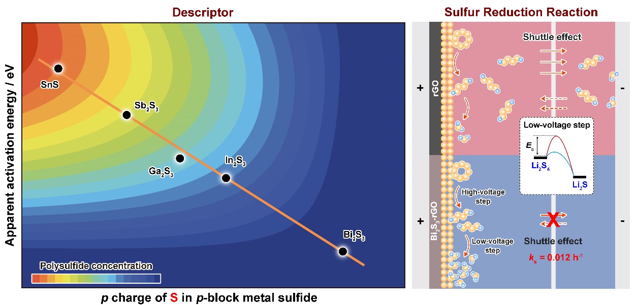 硫还原反应(SRR)涉及多电子转移,是获得高比能二次金属-硫电池的基本反应之一。然而,SRR反应速率缓慢,导致活性物质利用率低和电池循环可逆性差,同时活性物质硫以多硫中间体的形式溶解于电解液,造成穿梭效应,严重制约了金属-硫电池的发展。构建高效的SRR电催化剂,提高多硫化物反应速率,可有效提高硫活性物质利用率,抑制电池充放电过程中的穿梭效应。因此,硫还原反应的催化反应动力学研究是发展硫基高比能电池的关键。然而,基于催化剂电子结构和SRR活性之间的关联,针对SRR电催化材料逆向按需设计理论和方法的报道相对较少,提出一种实验可测量的电子结构参数作为描述因子,定量地描述其与催化活性以及电池性能之间的关系,对发展高效催化剂和高比能锂硫电池具有重要意义。
