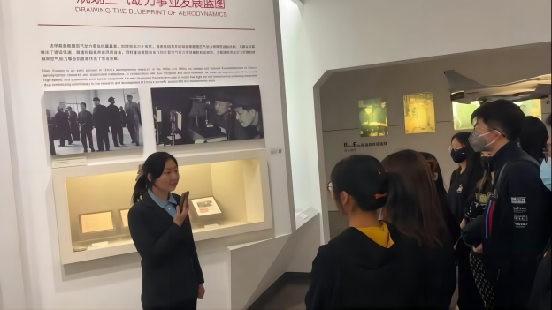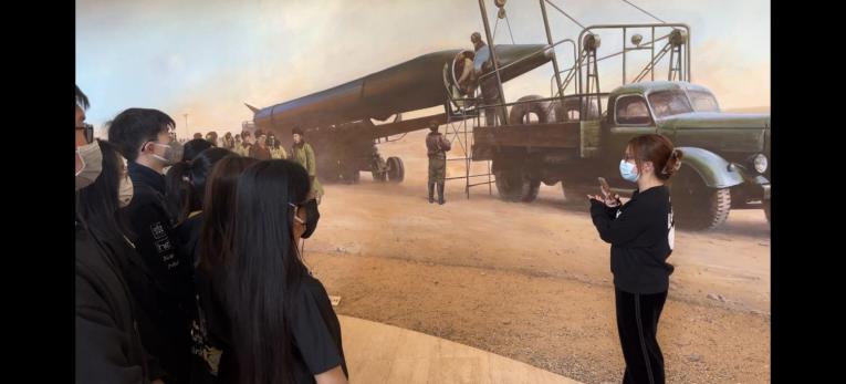 随后,支部成员前往钱学森图书馆参观研学,由团支委为同学们讲述钱学森先生的生平故事,带领同学们身临其境地体验钱学森先生的人生经历与丰功伟绩。步入序厅,在钱学森像前,班长丁旭明同学介绍了钱学森的求学经历以及艰难回国、赤心报国的故事;走入第一展厅,通过众多泛黄的手稿和黑白照片,组织委员常馨同学讲述了钱学森身上追求真理、严谨治学的求实精神;在两弹结合对接现场的展墙前,团支书蓝佳赟同学带领大家一起回顾了当时核事业发展的艰难情形;宣传委员杨诗婕同学在东风二号甲型导弹实体前向同学们介绍了东风二号导弹研发的历史背景和该导弹的基本构造,鼓舞同学们扎实学识、增强本领,以国家发展为己任,探索科技前沿。